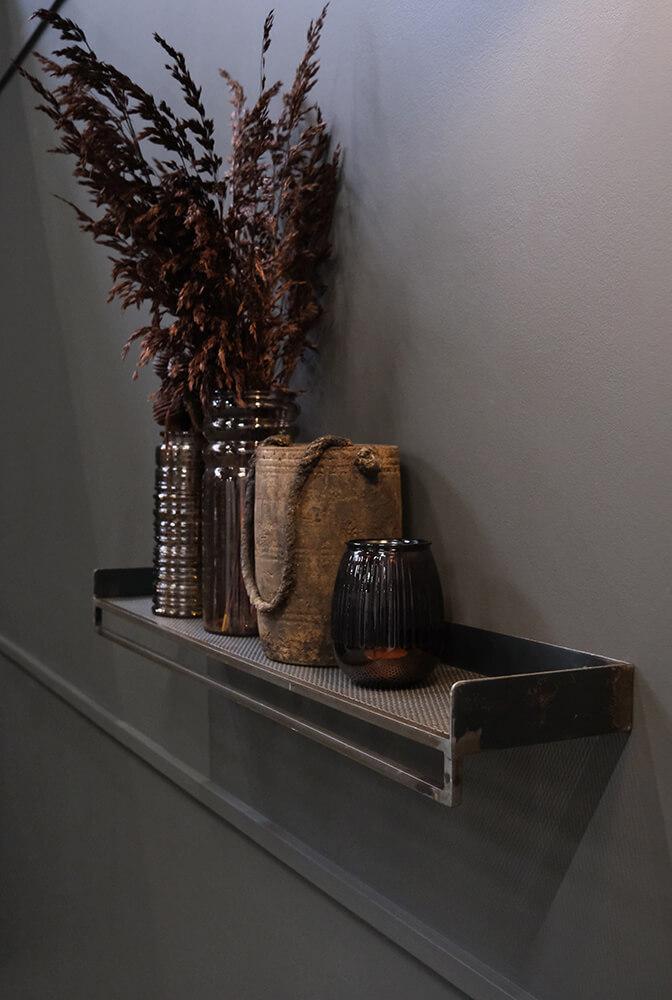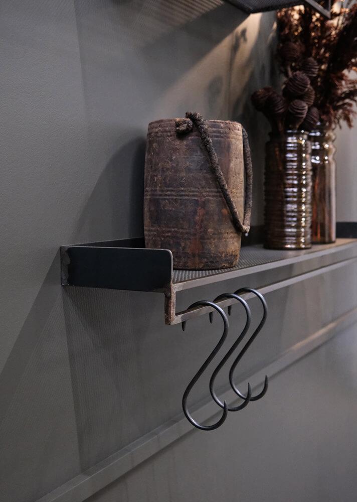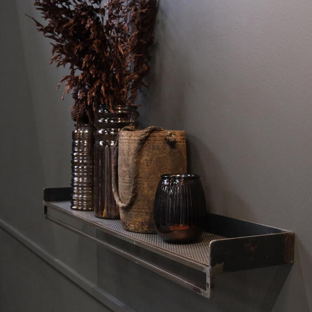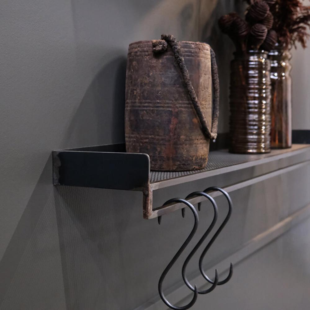 Bring the industrial style into your home decor with this raw perforated iron shelf. Use the shelf in your bathroom, for your towels and to create cosiness with scented candles and plants, or in your hallway where you can add our Mr. S hook (item number: M16596 + M1518) and use it for outerwear, scarves, and bags.