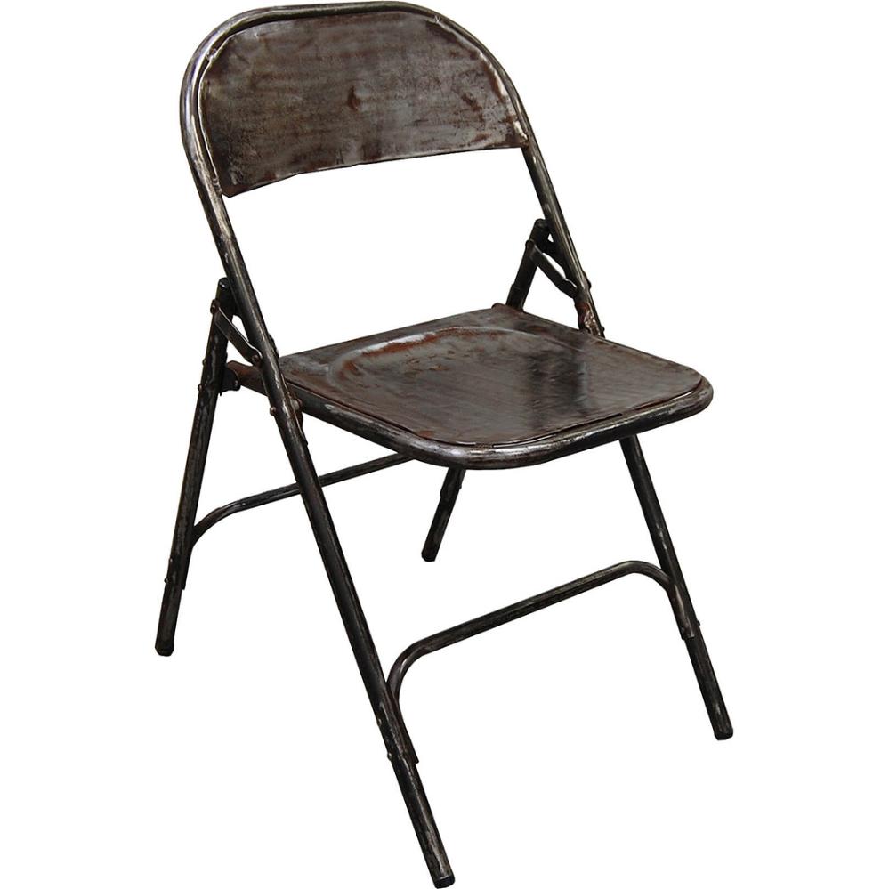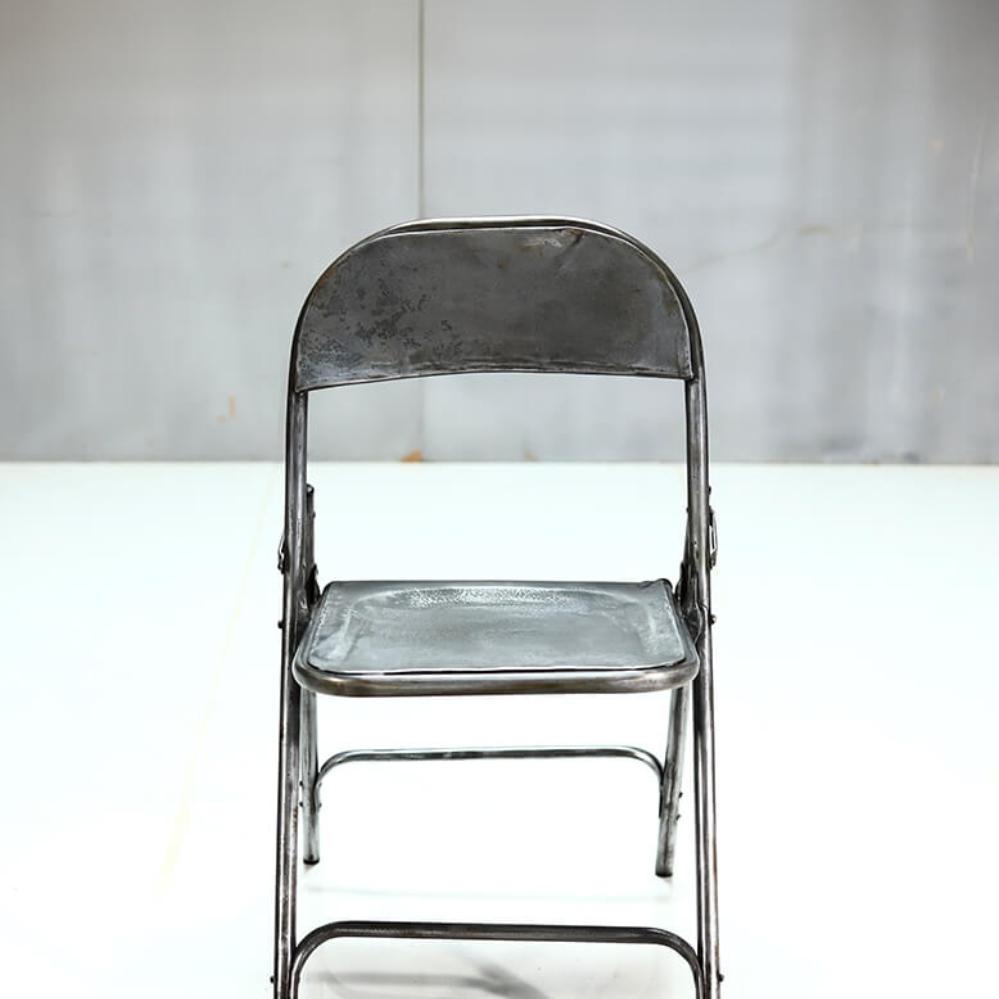 Old folding chair in polished iron with unique color and finish. The chair can add a unique look to the interior design or the garden. The chair is light and has a light expression. It has had its former life in the Far East, where it has been used as a canteen chair, dining table chair or school chair.