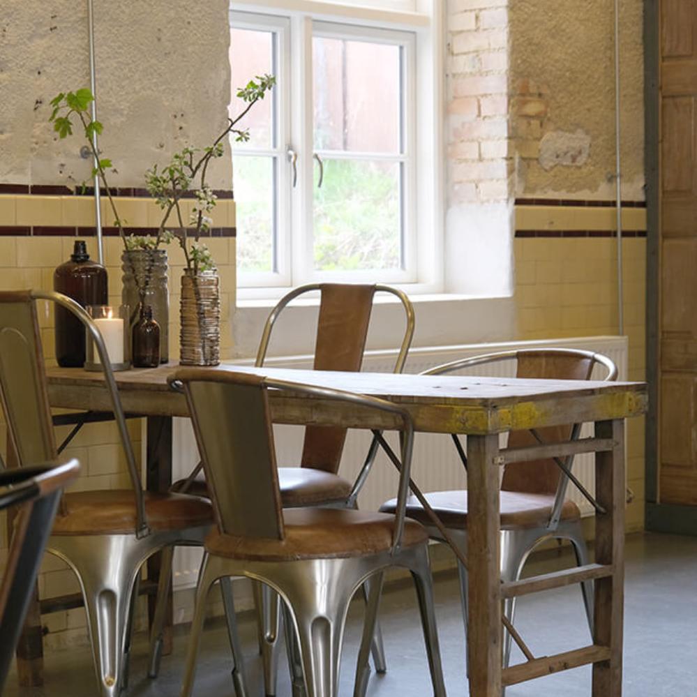 The Living dining chair shiny with armrests is the perfect choice for those seeking a raw and modern look. With a solid iron frame and a luxurious seat and backrest in cognac-colored leather, this chair adds character to both homes and professional settings like cafés and restaurants. The simple construction without padding gives the chair an authentic industrial expression, making it a beautiful match for both round and square dining tables. A dining chair that is practical, comfortable, and stylish – a true favorite from Trademark Living