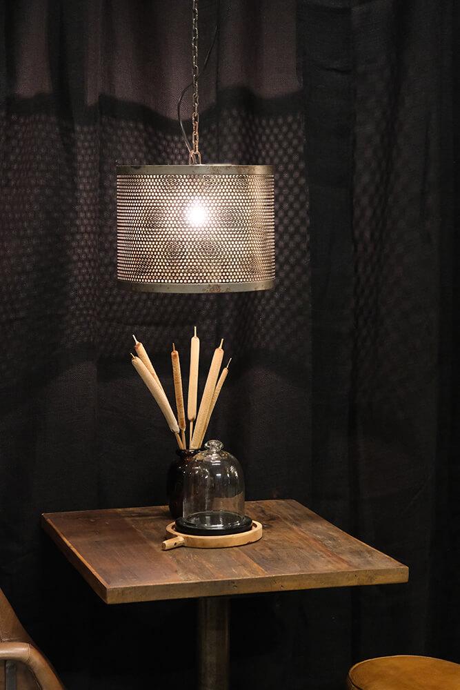 Kelly takes the breath away from most people. The patinated and perforated shade of the rustic iron lamp spreads a raw and industrial atmosphere, no matter what room it lights up. An iron chain is attached to the patinated lampshade and canopy, which adds an extra rustic touch to the lamp.