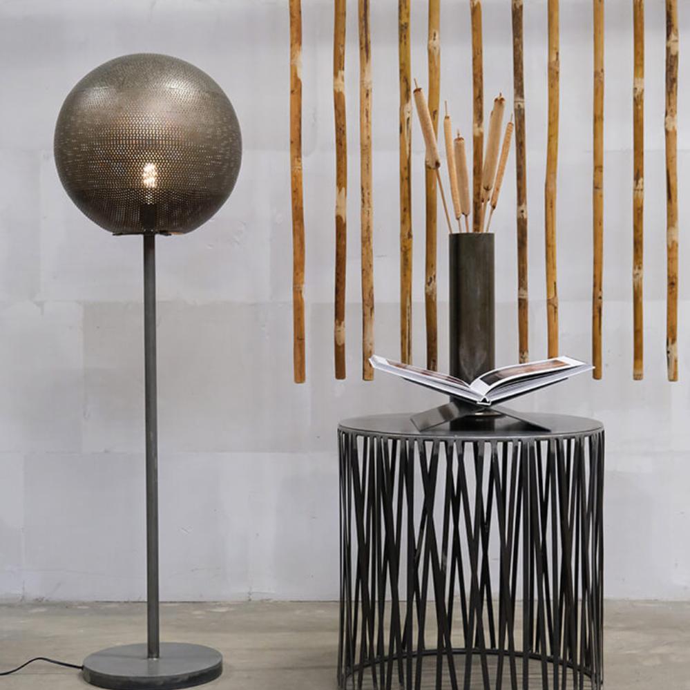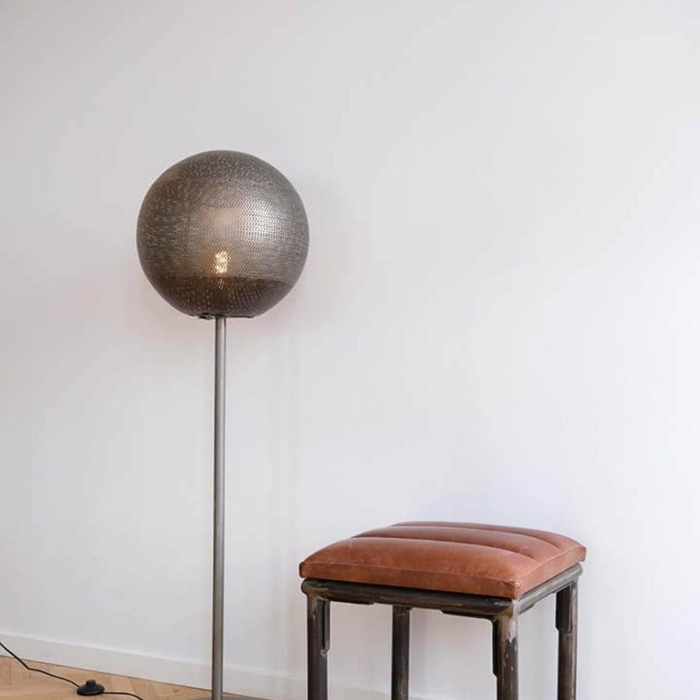 The Moonlight floor lamp in medium size is the perfect blend of masculinity and atmospheric lighting. Made of iron, it stands steadily on a round base with a diameter of 30 cm. A slim stem holds the distinctive round shade made of perforated iron and it’s the many small holes in the shade that create the magical play of light when the lamp is switched on. A solid choice for classic, minimalist, or industrial interiors. The Moonlight lamp is available in three sizes, so you can mix and match as needed.