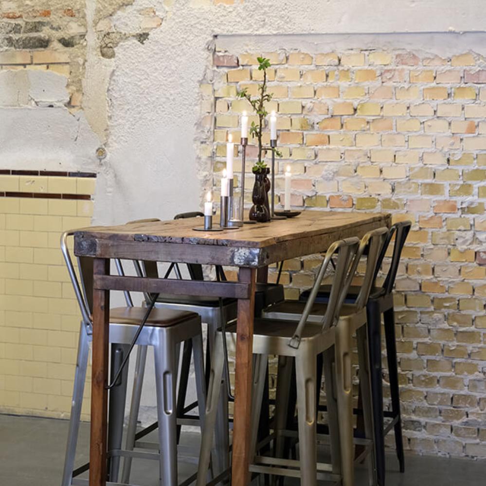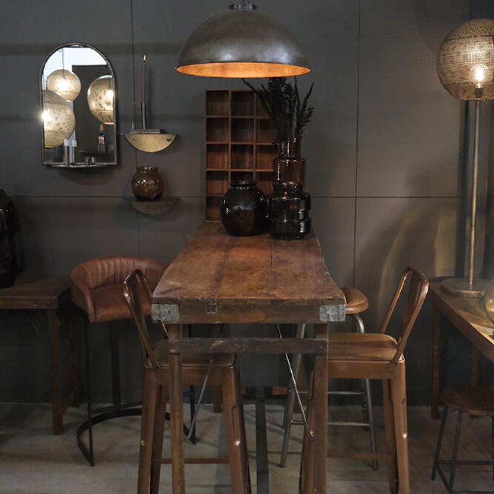 A raw and rustic high wooden table that adds personality to your interior. The table is made of reclaimed wood, and the natural imperfections give each table its own unique character. Our bar stools pair perfectly with this rugged table.
