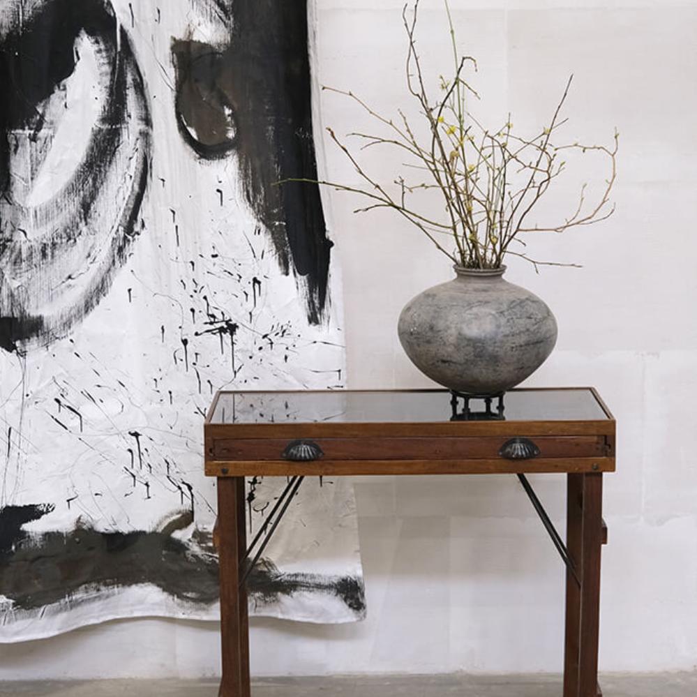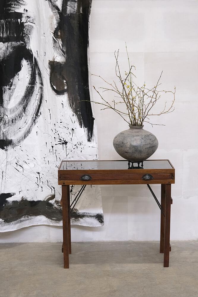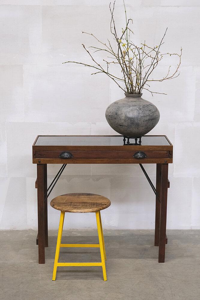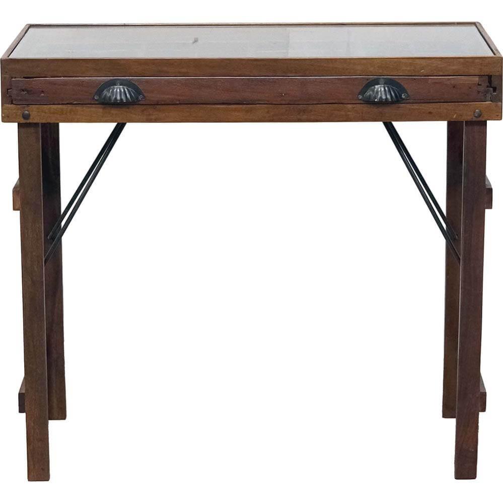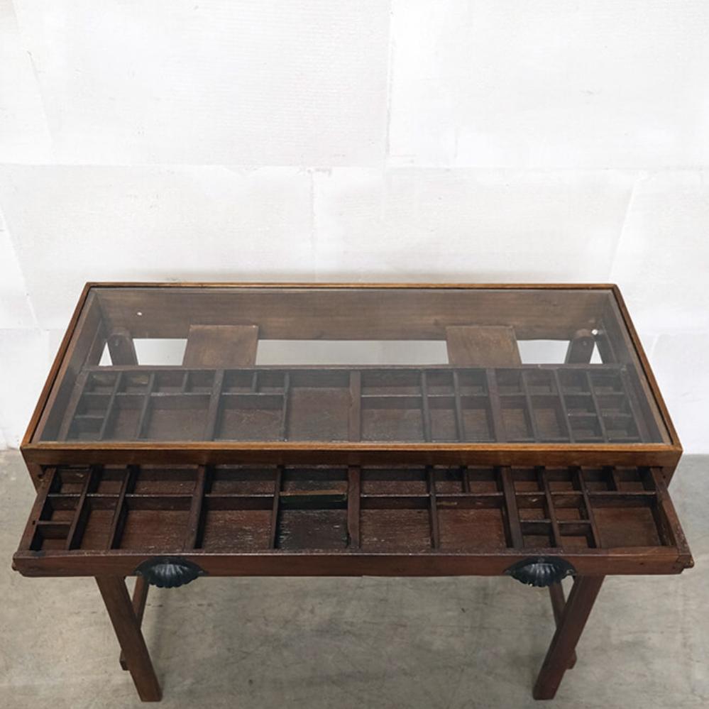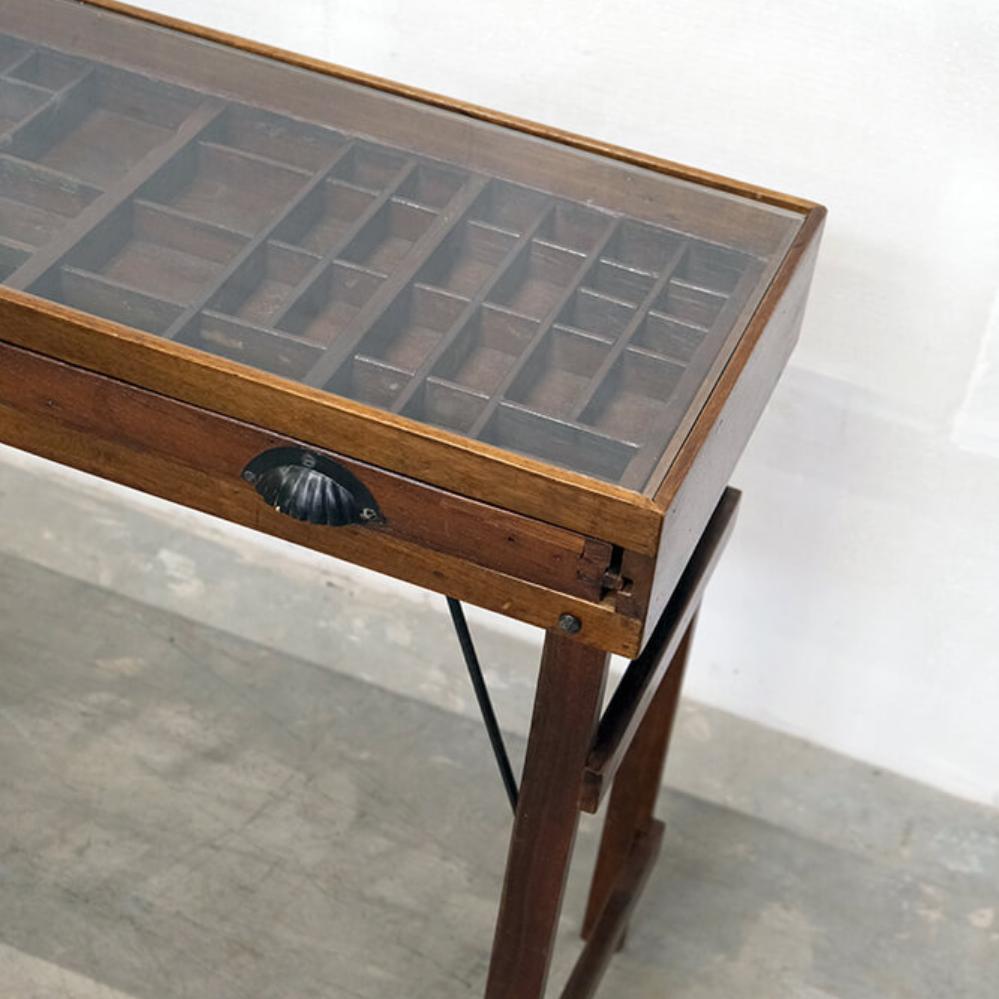 Lovely console table with an old typecase and glass top. The typecase was originally used in a printing press to store letter- and numeral blocks in various sizes and fonts. The typecase can be pulled out from the table, allowing you to beautifully organize and display small, delicate items - like e.g. jewlery.