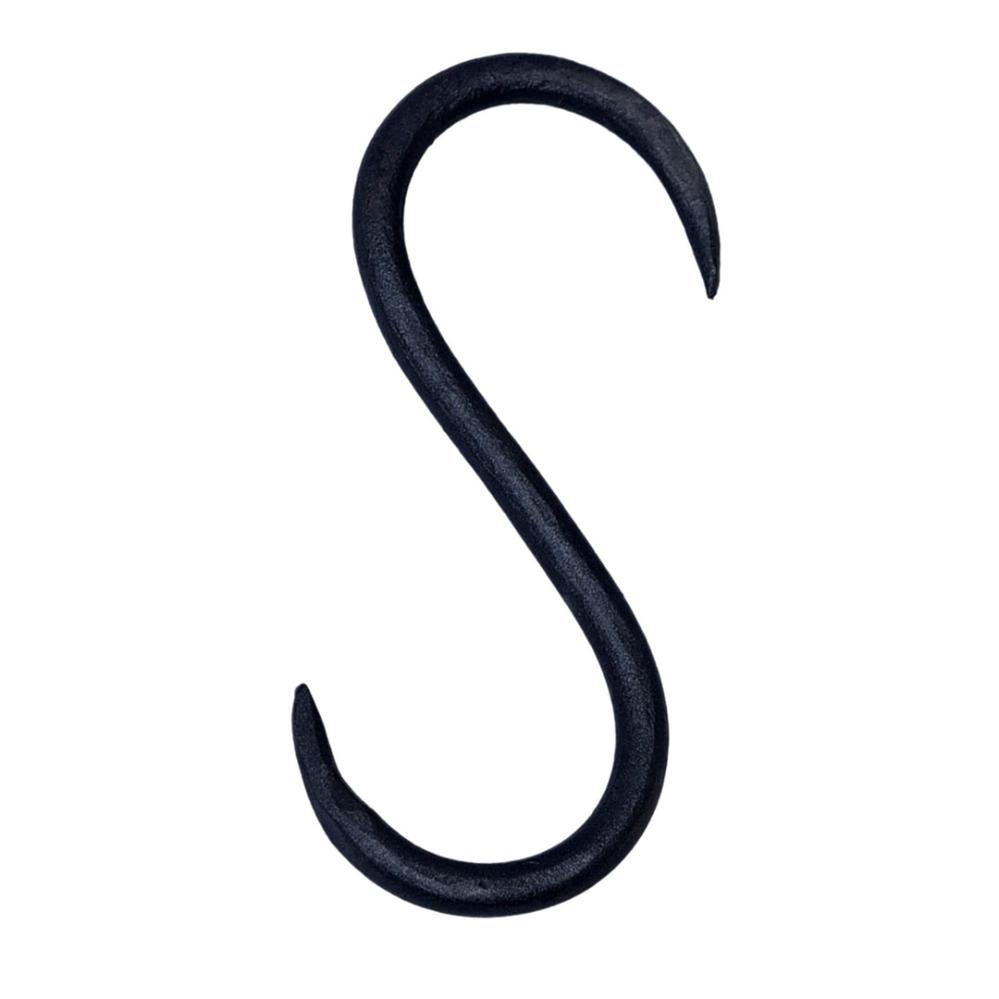 S hook in black painted iron. This hook has many uses. You can use the hook anywhere in your decor. In the bathroom for towels, in the hallway for jackets and bags, in the kitchen for tea towels and utencils, in your walk in closet for belts and accessories or for something completely different. A multifunctional product. It is available in both large and small.