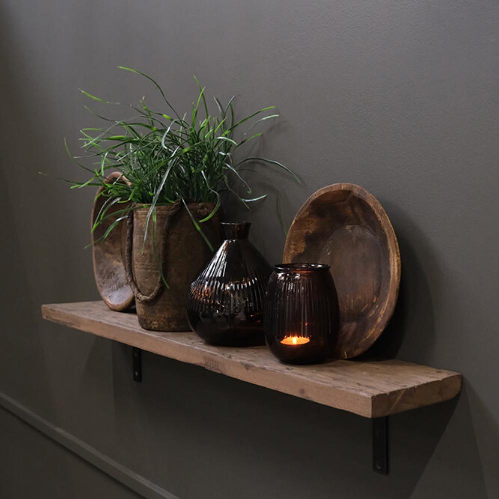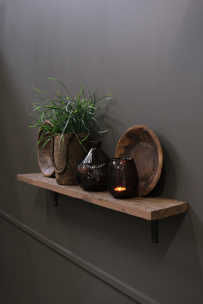 Raw shelf made of reclaimed wood. Two angle brackets are attached to the shelf, so it is easy to hang on the wall. The shelf has many uses and can be hung in any home space and in your business. Feel free to hang several shelves either on top of each other or next to each other. All shelves are different. For you who prioritize thinking reuse into your decor.