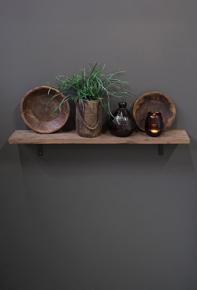 Raw shelf made of reclaimed wood. Two angle brackets are attached to the shelf, so it is easy to hang on the wall. The shelf has many uses and can be hung in any home space and in your business. Feel free to hang several shelves either on top of each other or next to each other. All shelves are different. For you who prioritize thinking reuse into your decor.