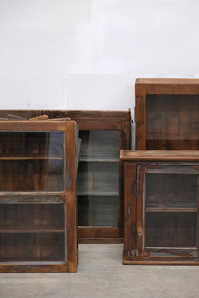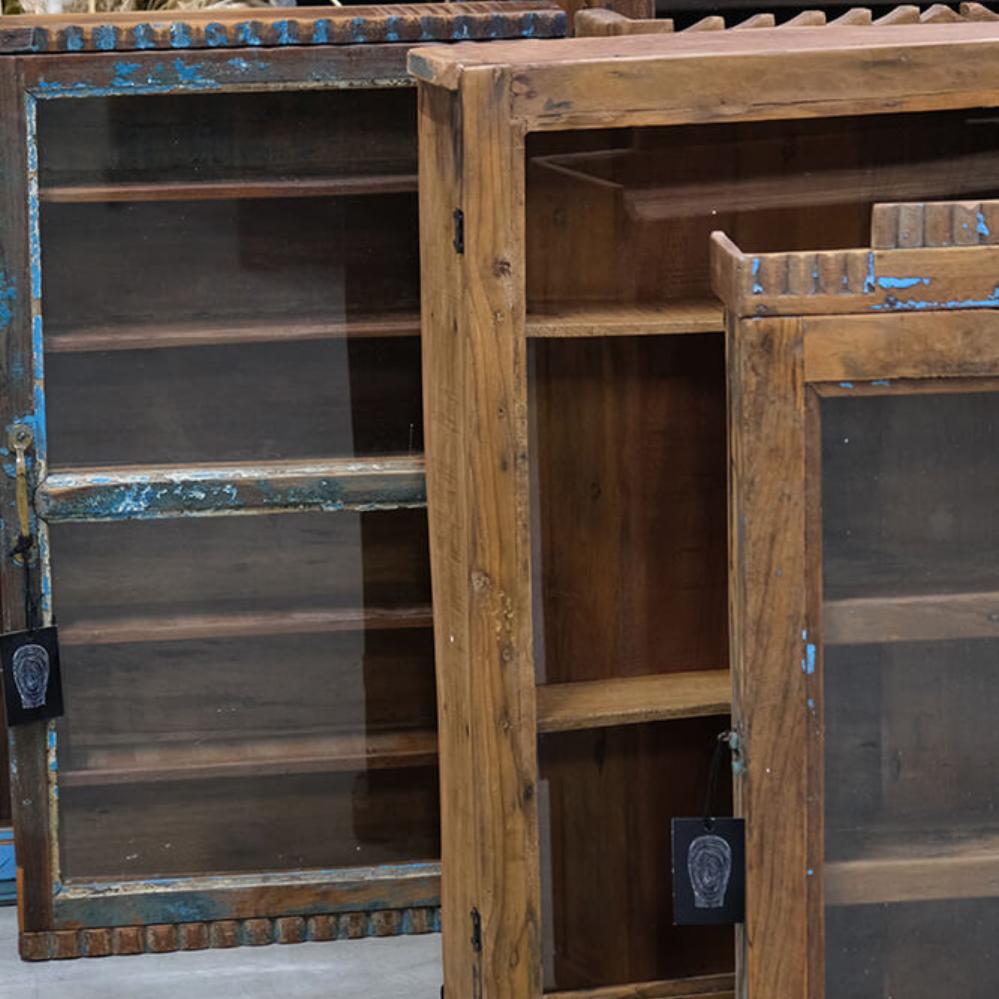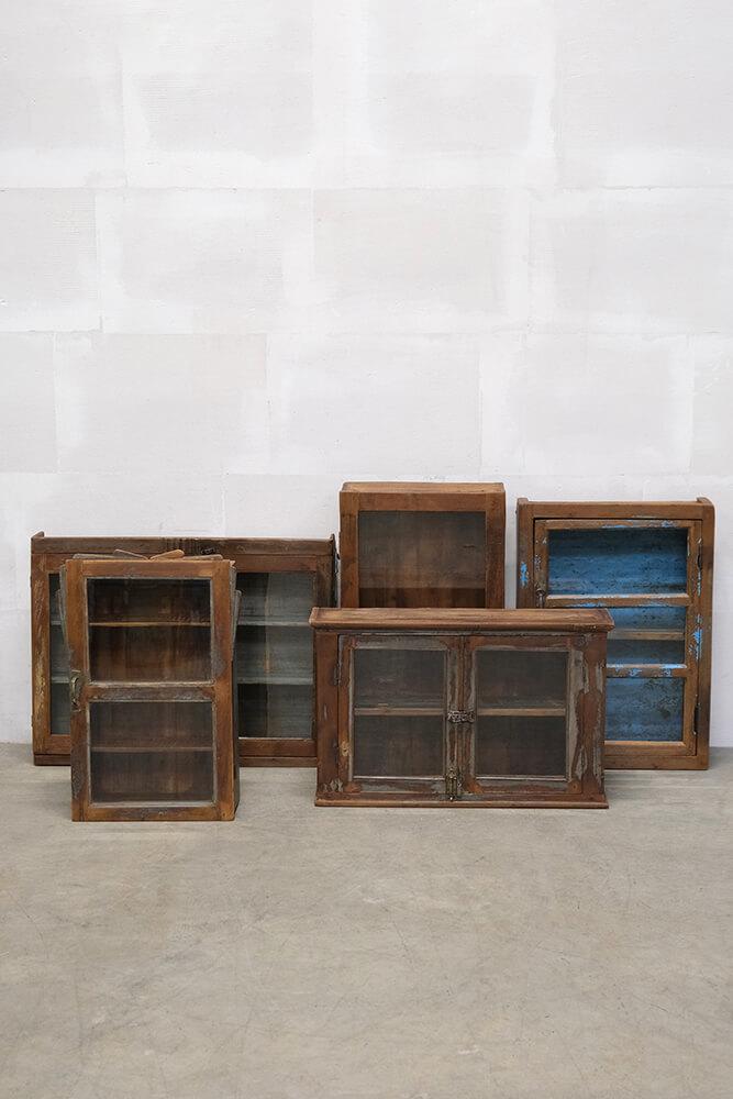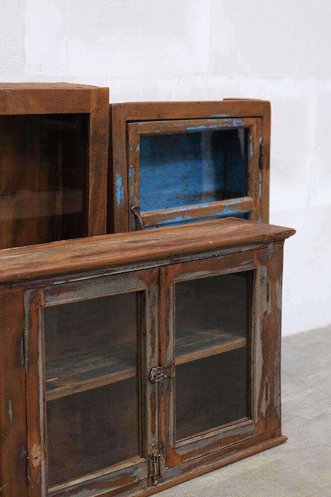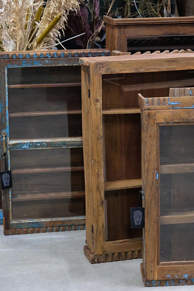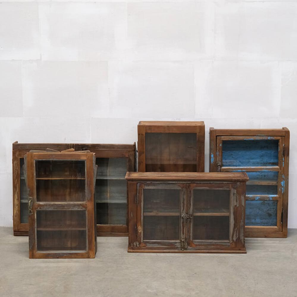 All of these beautiful wall cabinets have an authentic character and charm. Every cabinet features unique details and colours that tell its own story. The different layers of paint and patina give each piece a rustic, raw expression, perfect for creating a warm and personal atmosphere in your home or business. The raw, natural wood combined with the cabinets' original details makes them ideal for vintage decor and modern Nordic homes. These wall cabinets are perfect for storing and displaying small items with style and character.