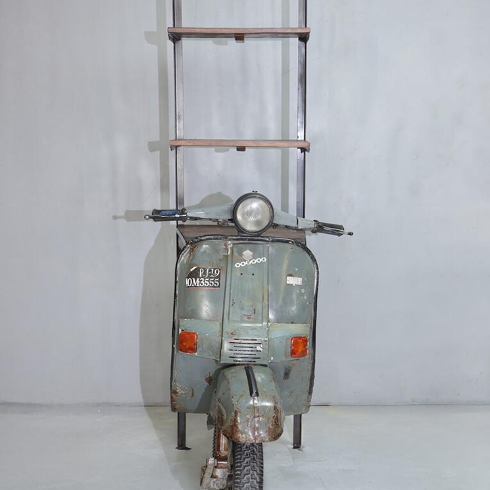 Here’s a piece of furniture that will truly spark conversation. This really cool bar rack is crafted from the front of an old scooter, complete with patinated paint and authentic details. The sturdy wooden shelves provide space for glasses, bottles, and decorative elements, while the built-in wine holders keep your favorite vines ready for serving. The rustic combination of wood and metal gives it a raw, industrial look that fits perfectly in a bar, café, or a bold home interior with an edge. A statement piece that combines vintage charm with practical storage and a hint of adventure on wheels.