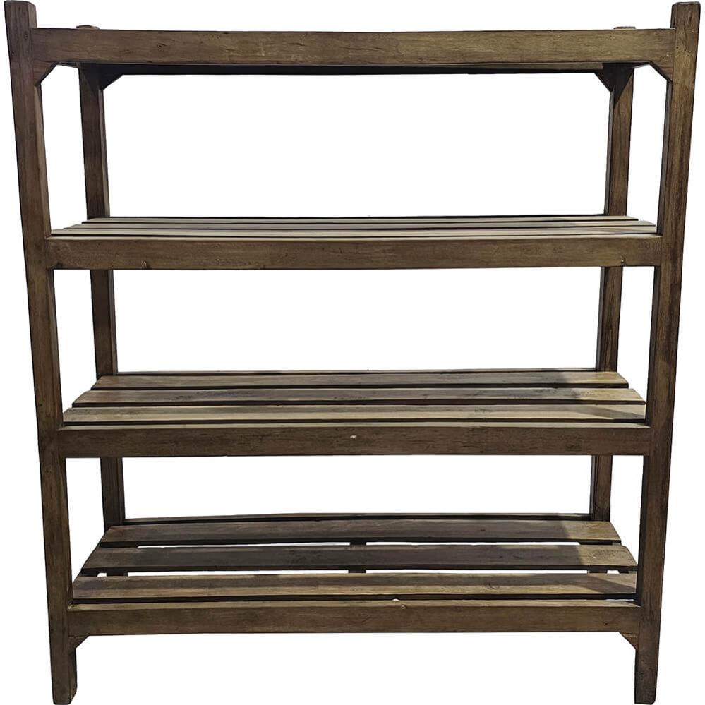 This wooden rack is simple, charming, and full of character. Handcrafted from solid teak, it has a natural, warm look with small quirks and imperfections that only add to its appeal. The slatted shelves give it a light and airy feel, while the construction is sturdy and practical. Teak is known for its strength and beautiful glow, and here you get it in its most authentic form: unpolished, rustic, and ready to use. The rack is old and proudly wears its signs of use, telling its story without filters. Use it in a shop as a display rack, in a restaurant for tableware and decor, or at home in the kitchen, office, or hallway. It fits wherever storage with personality and character is needed. A timeless teak rack with plenty of soul.
