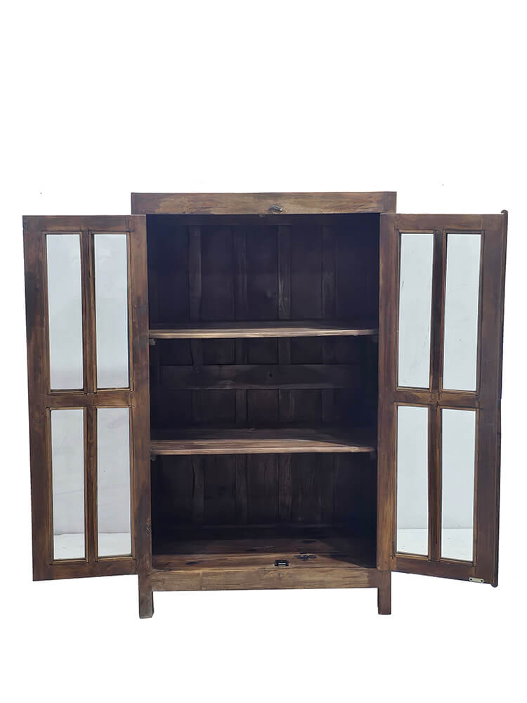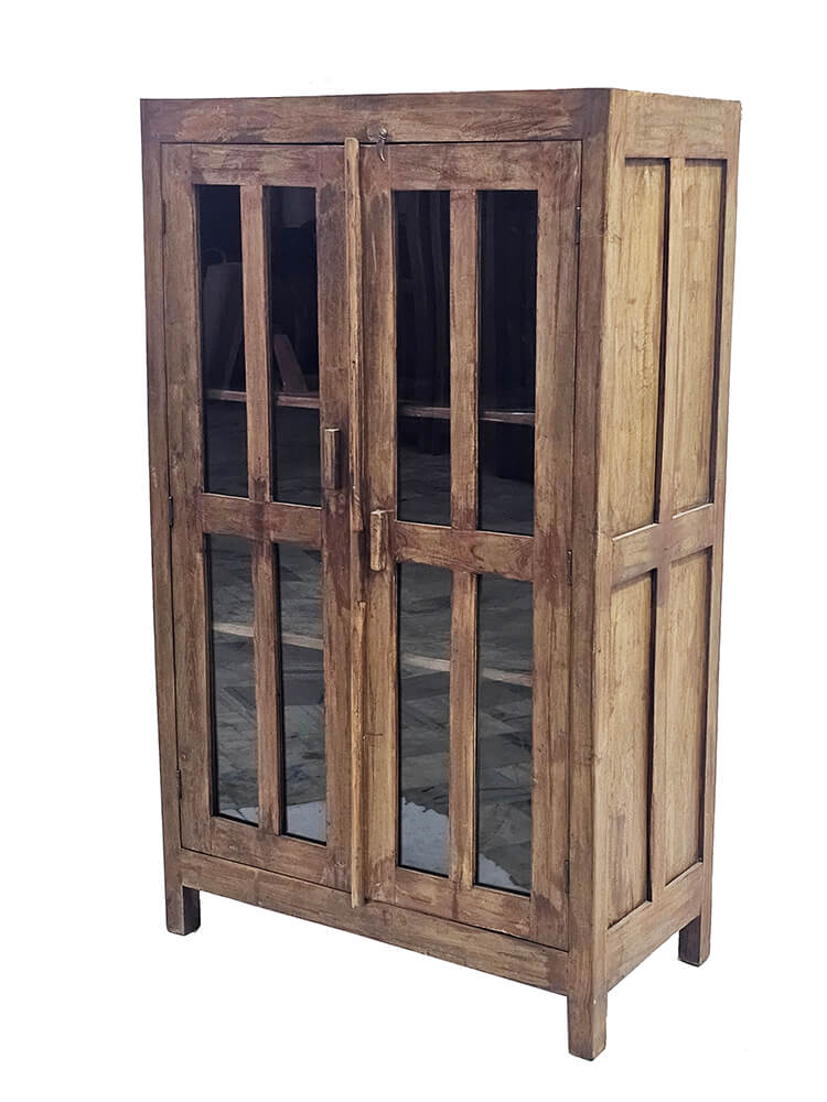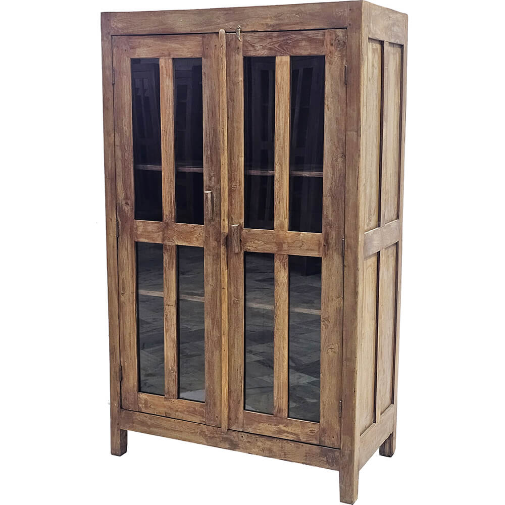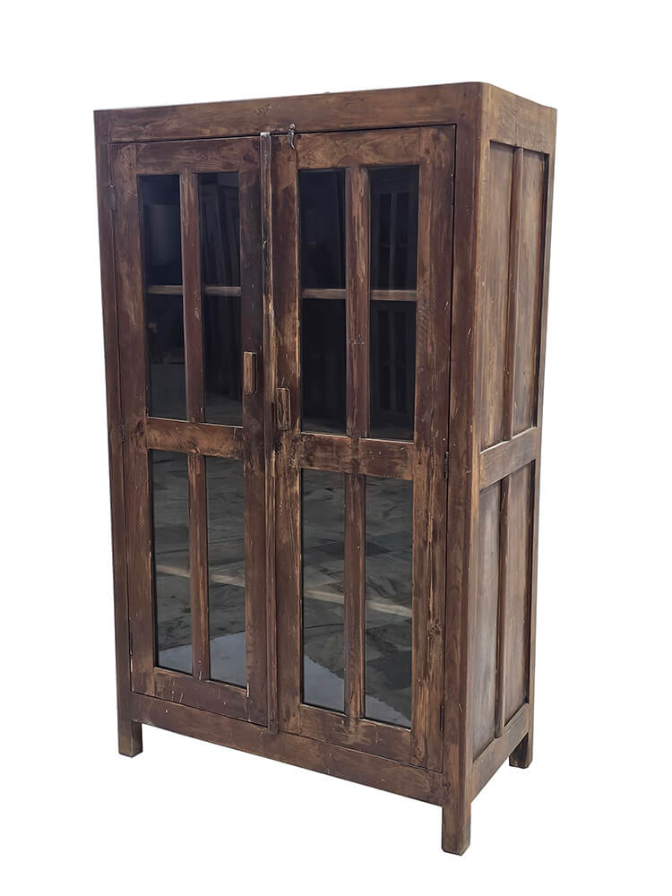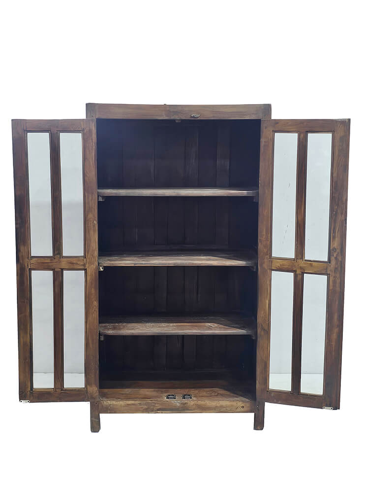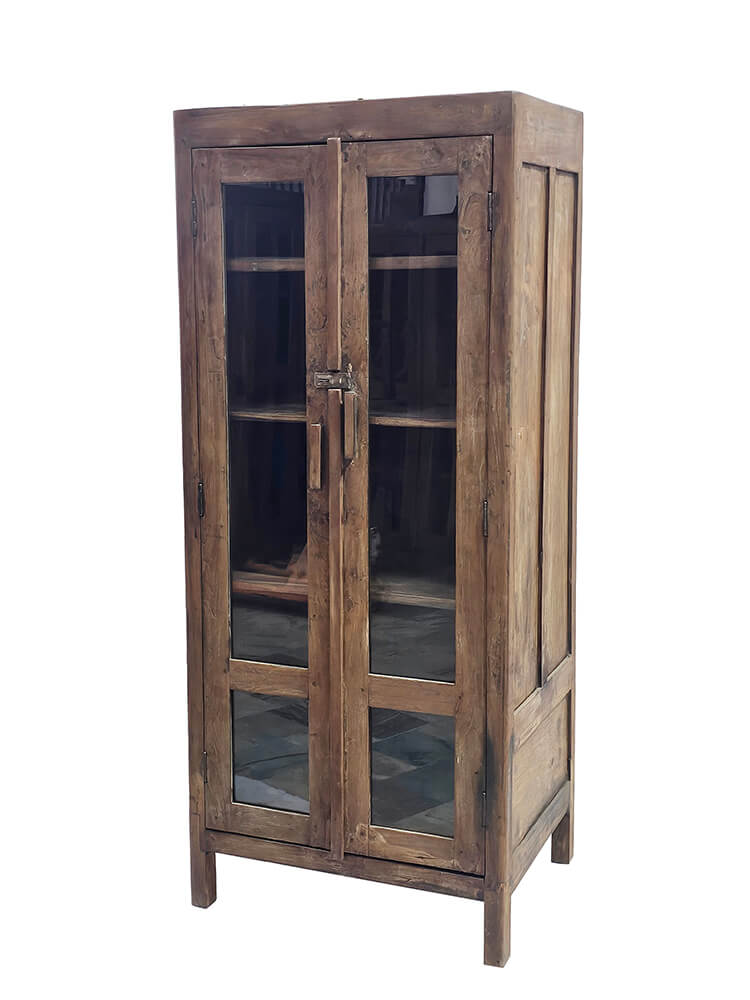 These old display cabinets are characterful pieces of furniture with a warm and rustic expression. The cabinets vary in design, details, and size, meaning each one has its own distinct look and story. The natural colour variations of the wood, wear marks, and patina create an honest and lively appearance that cannot be recreated in new furniture. The glass-panelled doors give a light and open feel and make the cabinets ideal for storing and displaying porcelain, glassware, books, or decorative objects. Inside, the cabinets offer shelves with generous space, while the solid wood ensures a sturdy and functional construction. The display cabinets fit beautifully into the living room, kitchen, or hallway and work just as well in private homes as in a shop, café, or showroom. A perfect choice for anyone looking for a unique piece of furniture with soul, where differences are part of the charm.