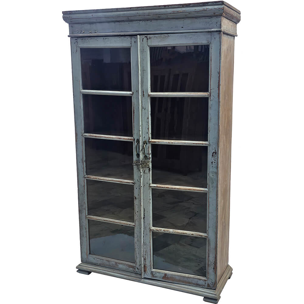 This old grey display cabinet is a beautiful and atmospheric piece of furniture with plenty of patina and history. The muted grey colour combined with the dark wood interior gives the cabinet a calm and elegant expression that fits perfectly into classic, rustic, and modern homes. The cabinet has two glass doors with fine muntins that provide a clear view of the contents, making it ideal for storage and display of tableware, glassware, books, or decorative objects. Inside, the cabinet features five shelves, offering generous space and many possibilities for use. The original surface shows signs of age and wear, which only adds to the cabinet’s authentic charm. A characterful display cabinet that works just as well in the kitchen or living room as in a shop, café, or showroom.