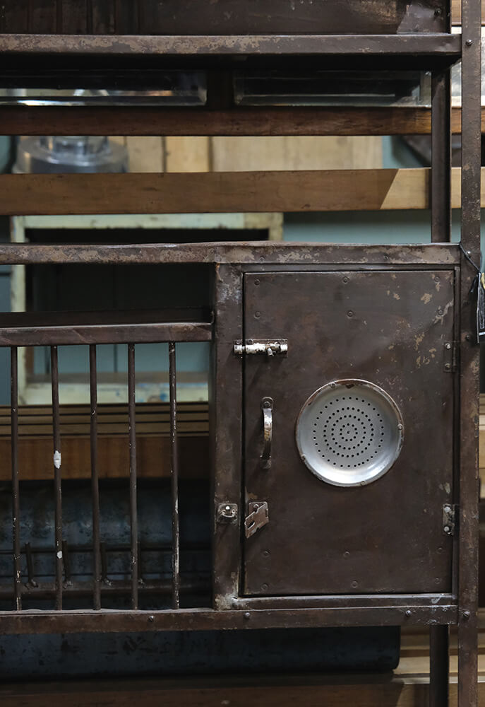 This old metal shelf exudes rustic charm with its patinated look. It is divided into three sections with open shelves, a plate holder, and a cabinet door featuring a quirky ventilation hole. The raw and industrial style of the cabinet makes it a striking piece for any room, where it can both create an authentic atmosphere and provide practical storage. Perfect for a kitchen with a raw style or to add an industrial edge to a modern interior.