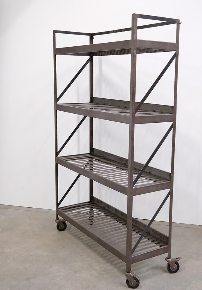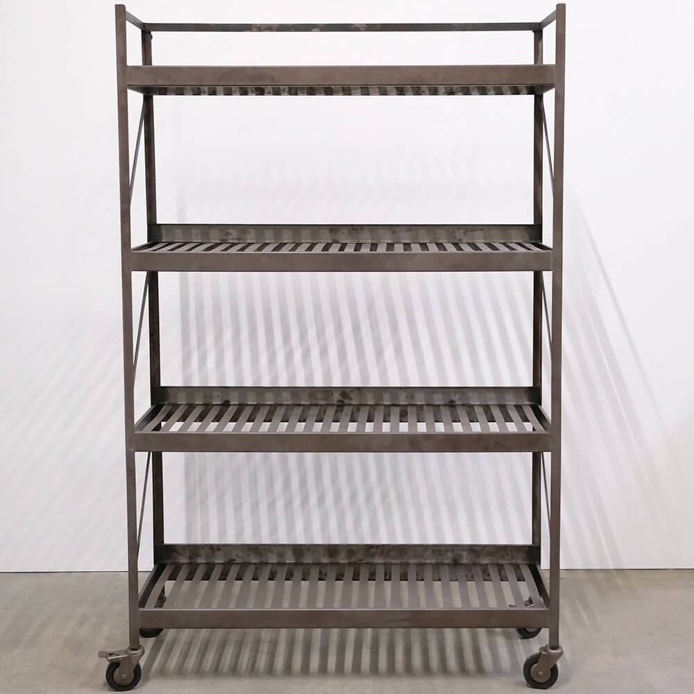 This rack knows what it is meant to do. Made of iron, it stands sharp with its five slatted shelves that give a light look, even though the construction is solid. The open shelves make it easy to see what you have stored and add air to the interior instead of closing it off. The wheels make it flexible. You can move it around as your needs change, from kitchen to shop, from storage to display. It adapts without complaining. This is a rack that works. No fuss. Just good, honest storage with a bit of edge.