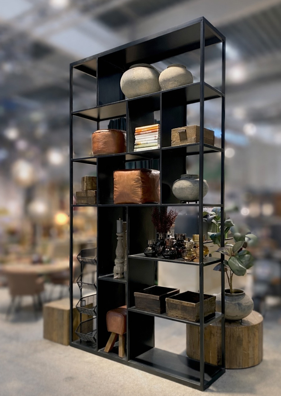 This impressive and gigantic black iron shelving wall is a true statement piece. Standing over 3.5 meters tall, it demands high ceilings and captures attention in any space. The shelving wall features a minimalist and modern design with asymmetrical shelves. The sturdy iron and black finish give it an industrial look, making it perfect for large spaces such as offices, shops, or as a dramatic room divider in a restaurant or home. It offers ample space to display books, art, plants, or decorative items – only your imagination sets the limits!