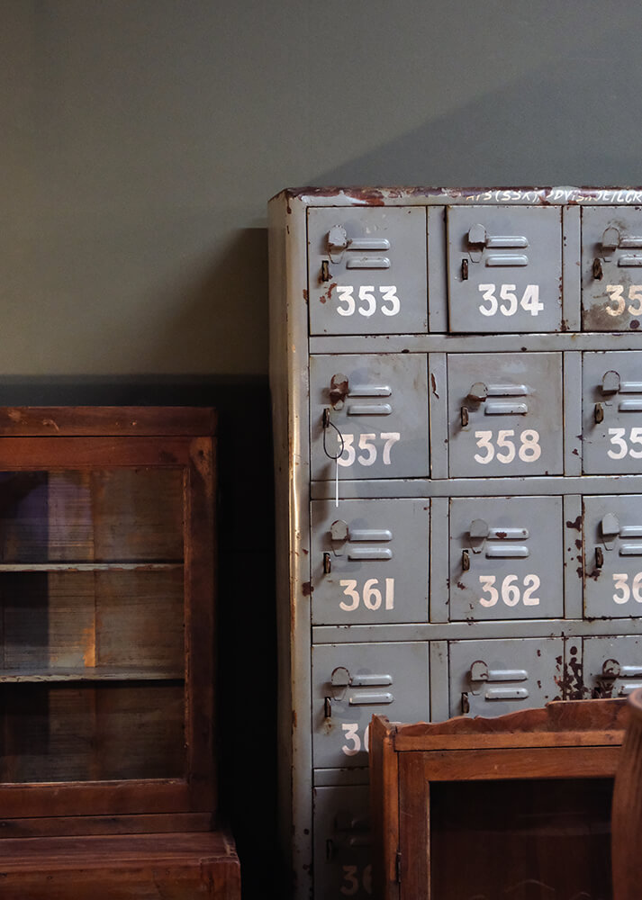 This old locker cabinet with 32 doors exudes industrial nostalgia and raw patina. Each door has its own number, adding an authentic and unique touch that speaks of a past in a factory or locker room. The rusty details and worn surfaces give the cabinet plenty of edge and personality, making it a perfect statement piece. Use it in a restaurant or shop to create a retro, industrial atmosphere—perhaps as storage space for small items or decorative elements. In the home, it can serve as a cool storage unit that adds both functionality and lots of character to the room.