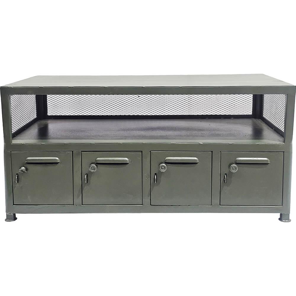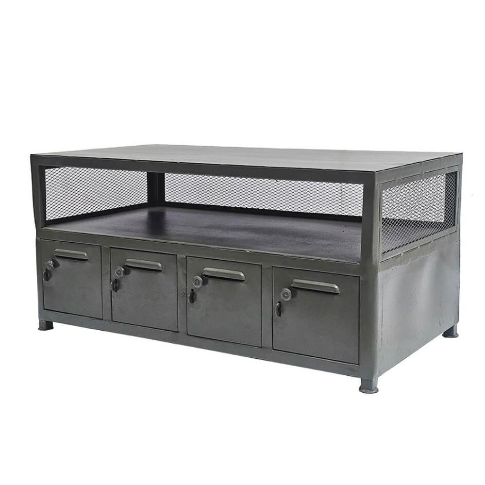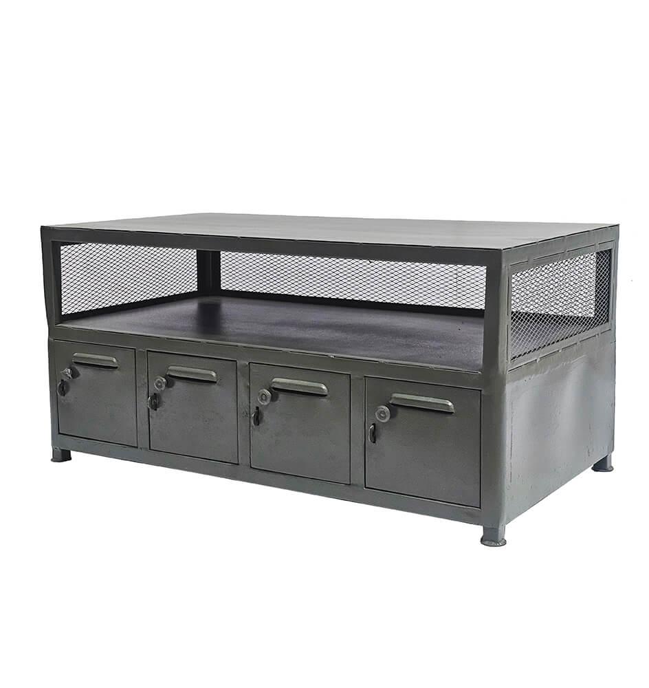 This raw sideboard has been upcycled from an old locker cabinet, showcasing a masculine and industrial style. With its 4 spacious doors, it offers plenty of storage for everything from books and clothes to tableware. The top open shelf with a metal mesh adds both functionality and a light visual appeal, making it ideal for displaying decorations or storing easily accessible items. A perfect addition to cafés, shops, or your home, where it can serve as both a practical piece of furniture and a distinctive centerpiece.