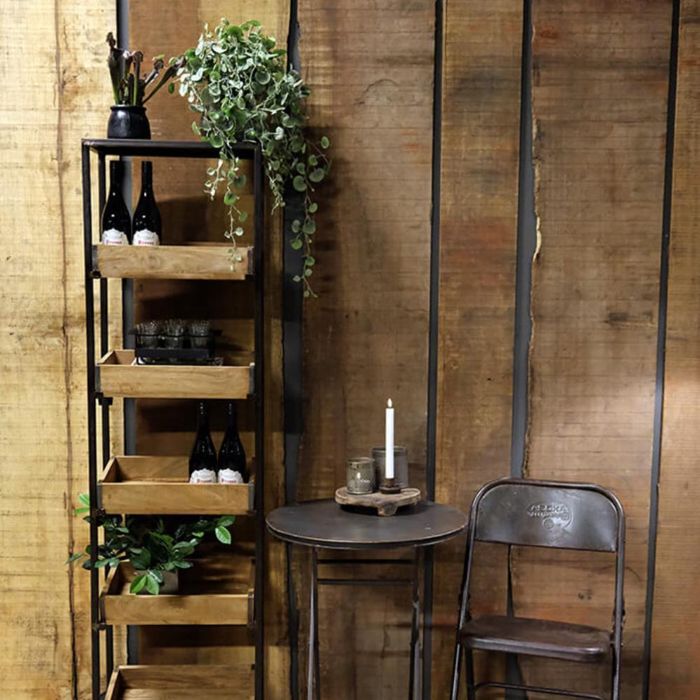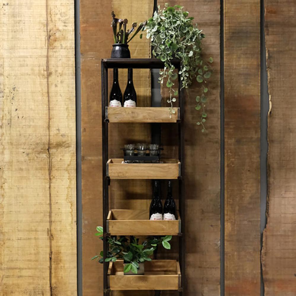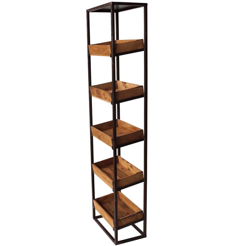 Narrow, tall iron rack with five trays made of reclaimed wood - all wooden trays are removable. The shelf is extremely functional and practical. For those who want to keep order or who want to use the rack as part of their store inventory. This enables you to present your goods to your customers in a simple and nice way. Is perfect for specialties, fruits and vegetables, hair products or something completely different. Have fun! Wooden tray: 43x26x9 cm