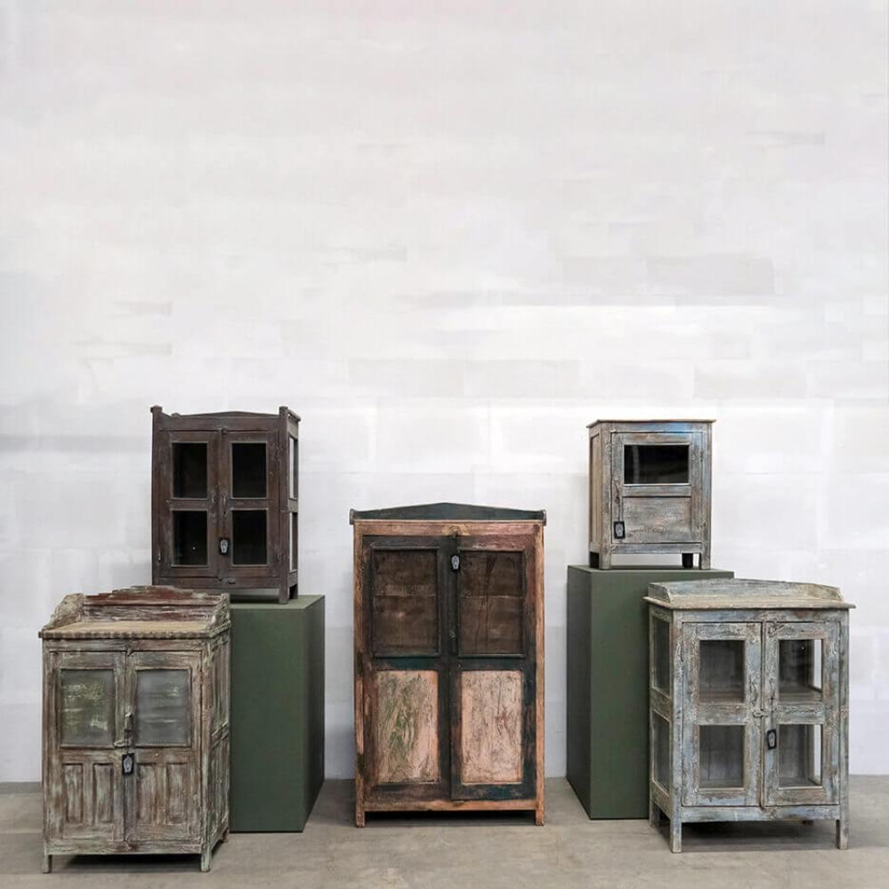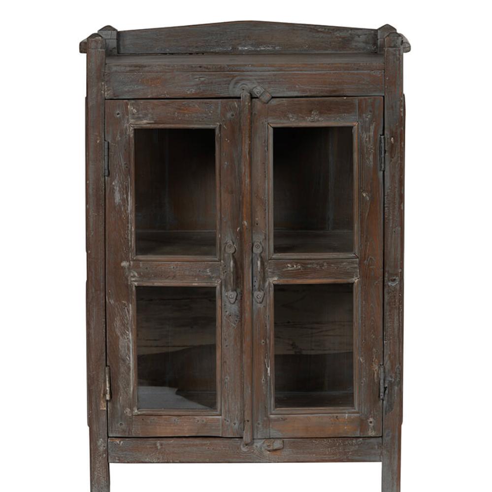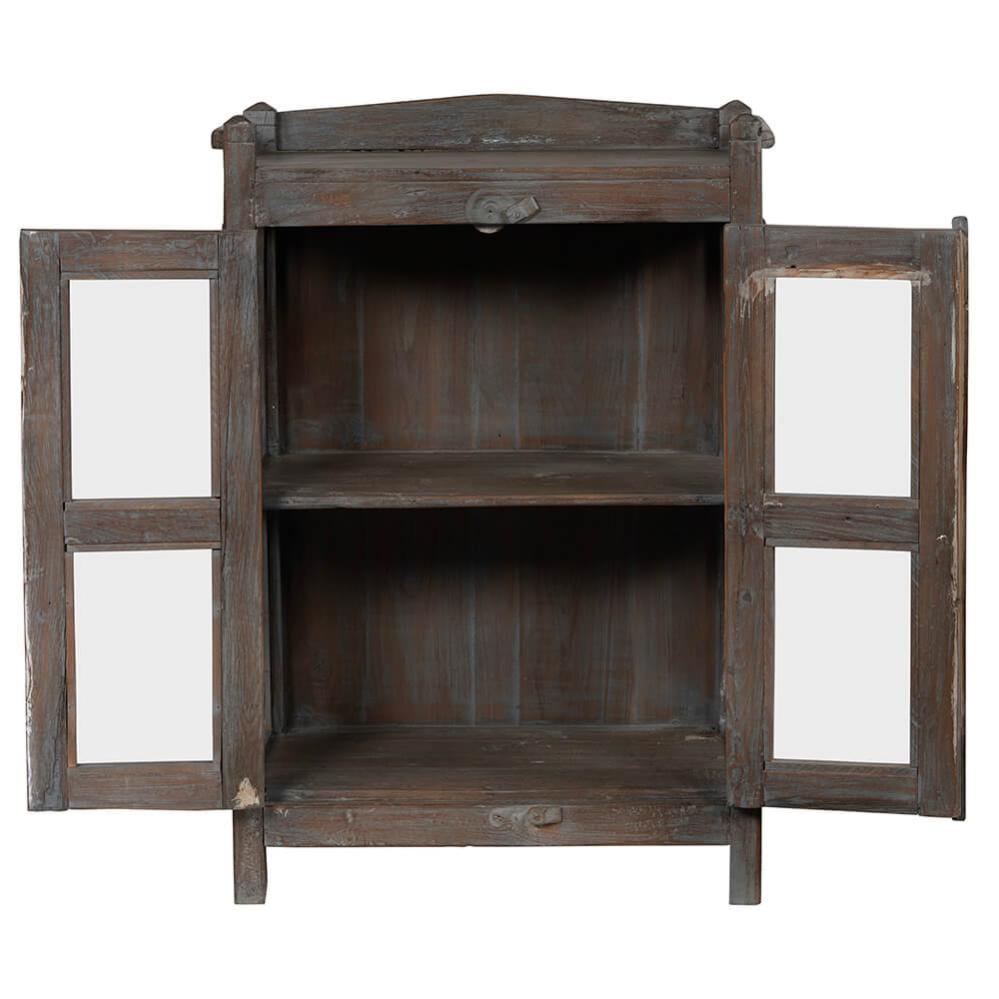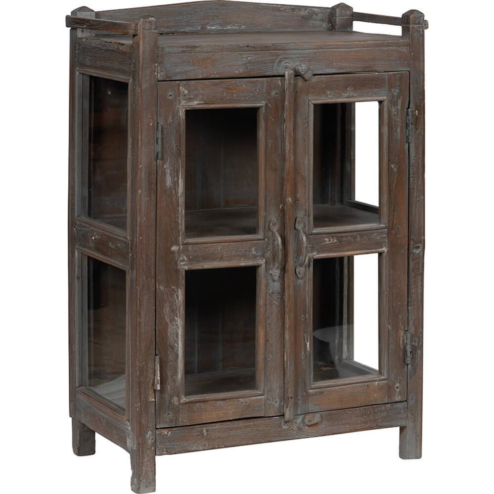 Beautiful old display cabinet with two glass doors and glass on the sides. The cabinet has a beautiful grey-brown patina both inside and outside. The cabinet has a shelf and provides good storage options. Requires only a little space but gives so much to the decor! Perfect for a Nordic interior style.