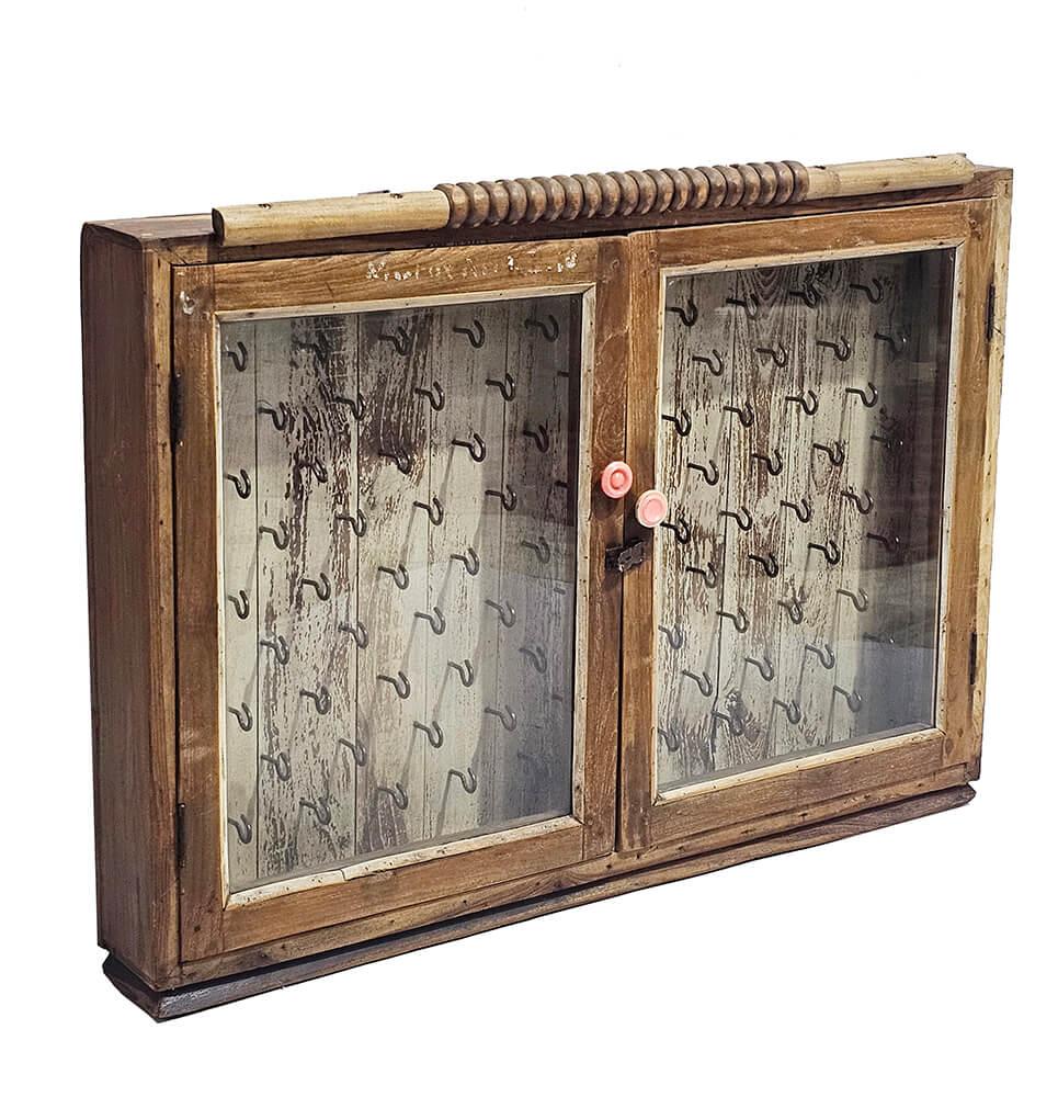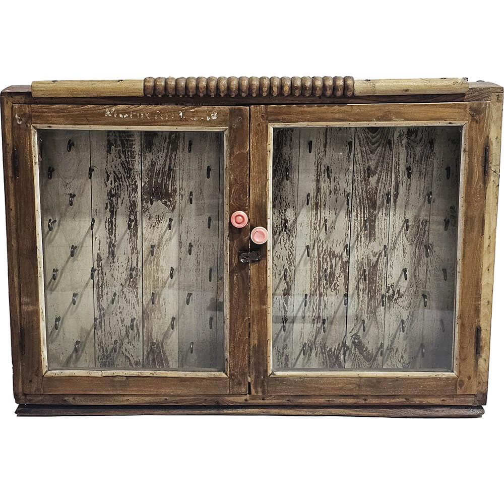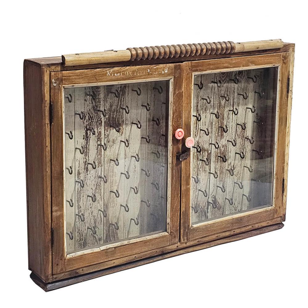 This charming old key cabinet is a little treasure from the past, full of character and patina. The cabinet has two glass doors, delicate pink porcelain knobs, and an interior back panel with rows of small hooks, offering space for many keys. The top is adorned with a decorative wooden detail that highlights its handcrafted look, and the worn wooden surface tells its own story. We only get this key cabinet in a very small batch, and although the individual pieces resemble each other, each one has its very own expression. Perfect for the hallway, shop, or as decorative storage in your home if you love unique finds with an edge.
