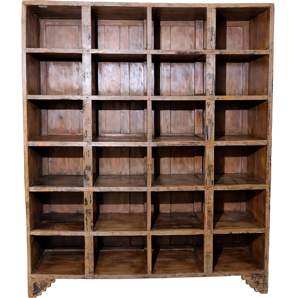 This old wooden rack with 20 compartments is full of charm and makes it incredibly easy to keep things organised. The many small compartments give you endless possibilities, whether you use it for wine, ceramics, hallway storage, or as a decorative display in a shop. The wood has the perfect patina, with wear marks and colour variations that tell its own story and give the shelf a warm, authentic expression. The solid construction makes it stable and practical, while the design ensures it also works as a characterful focal point in your interior. In short: a rack with both personality and function. Perfect for anyone who loves furniture with soul and a raw, natural look.