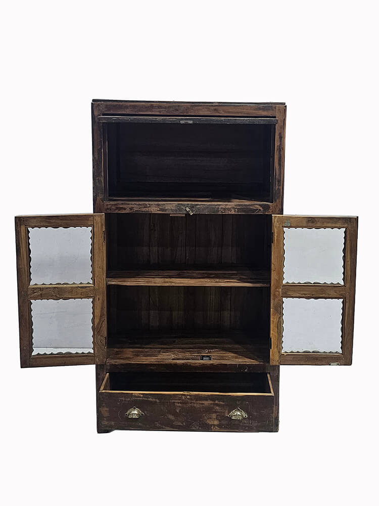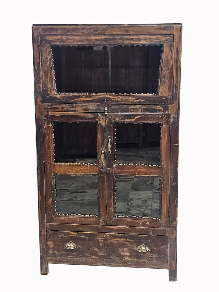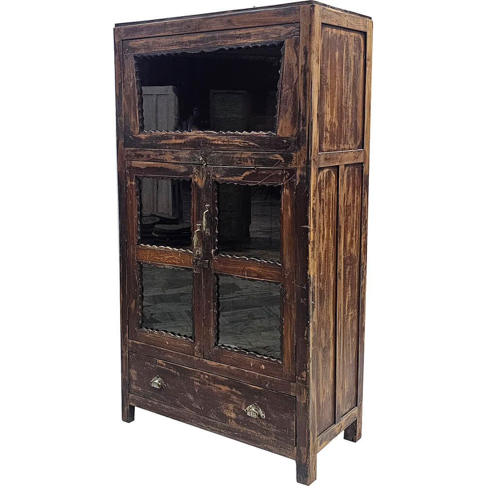 This display cabinet with three doors has a warm and rustic look, where the natural variations of the wood and the worn surface add plenty of character. Originally, the piece served as an old radio cabinet, something that can still be sensed in its proportions and distinctive construction with the upper glass section. This gives the vitrine a unique story and soul. All glass doors feature beautiful, wavy glass panels that create a soft and slightly distorted view of the contents. At the top, a separate glass compartment now works perfectly as additional display space. At the bottom, the piece is completed by a spacious drawer with fine, classic handles, ideal for storing smaller items. Inside, the shelves offer great opportunities to showcase porcelain, glassware, or personal treasures. A unique cabinet with an intriguing past that brings atmosphere and history into your interior.