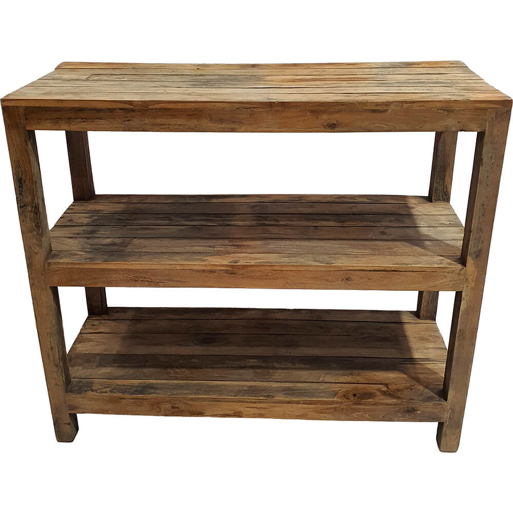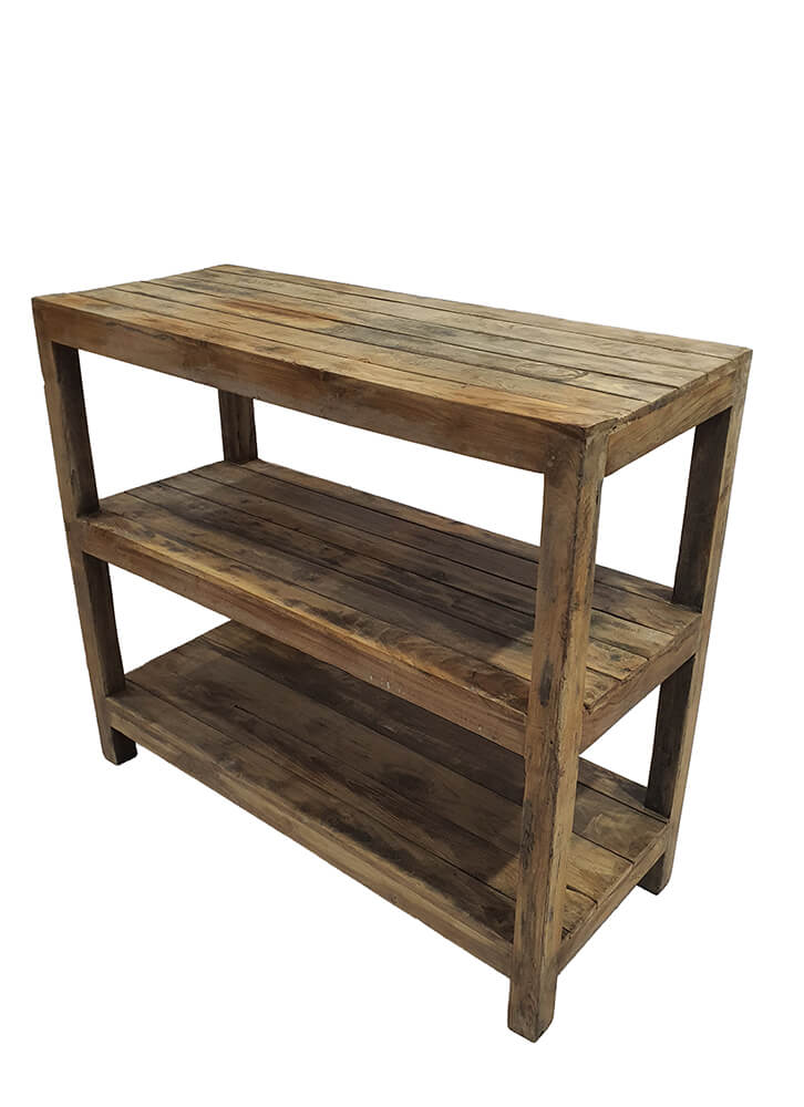 This low wooden rack is a simple and practical piece of furniture with plenty of warmth and character. It is made of solid wood, where the grain patterns and natural marks create an authentic, rustic expression. The rack has three spacious shelves, making it ideal for storage in the hallway or kitchen, or for styling in the living room or a shop. The open construction gives it a light and calm look while offering ample space for baskets, ceramics, books, or plants. A versatile piece that is easy to place and adds a natural, warm element to any interior.