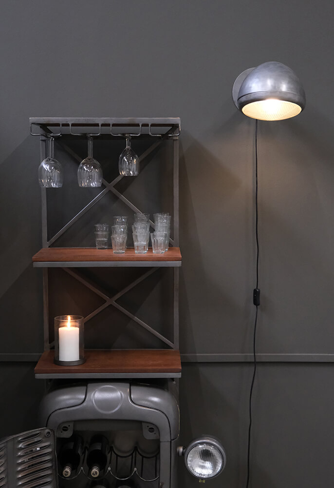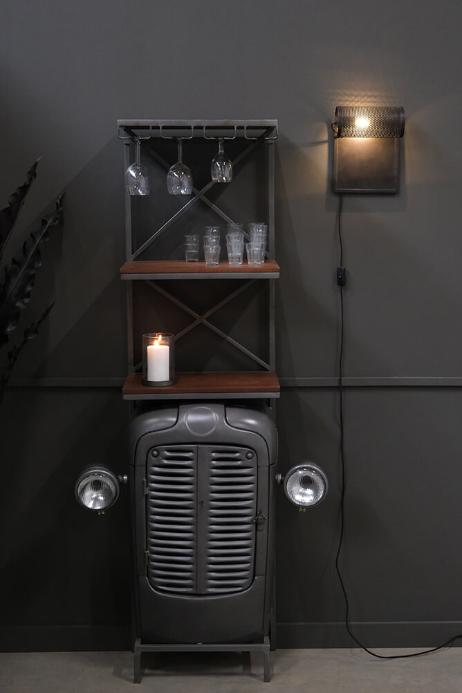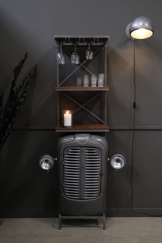Cool rack with old tractor front. The rack has a nice detail that allows storage of 8 bottles of vin and iron suspension for glass with stem. The rack has two wooden shelves. NOTE Width: 51cm shelf / with the lights 85cm.