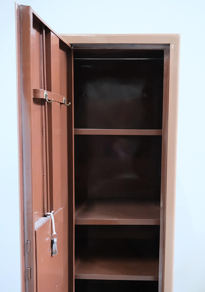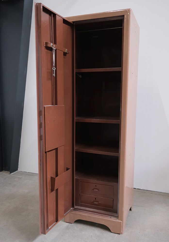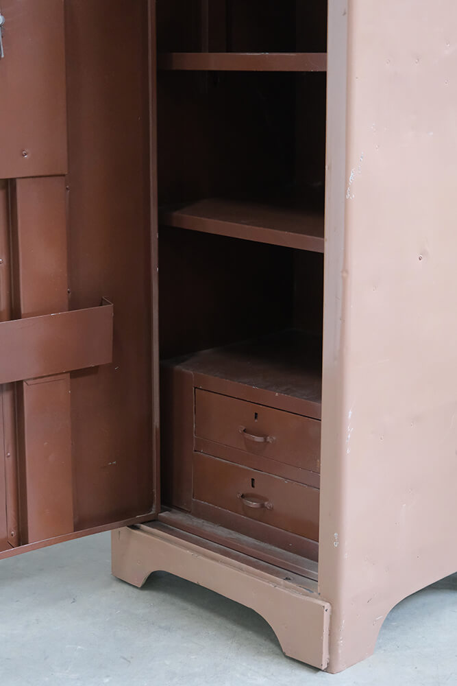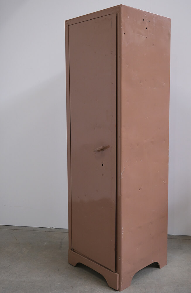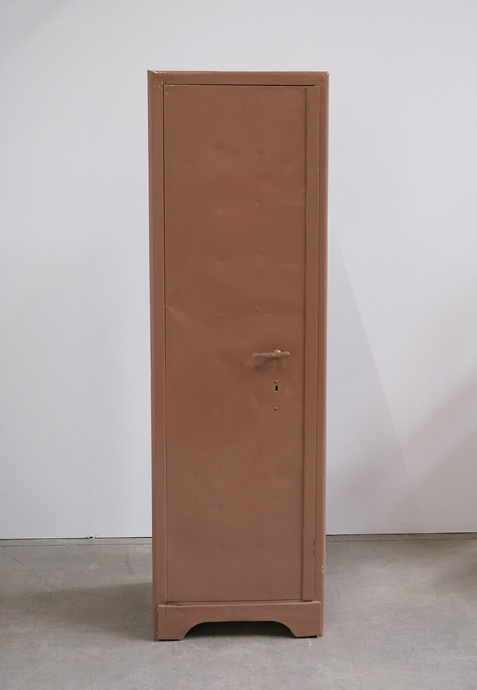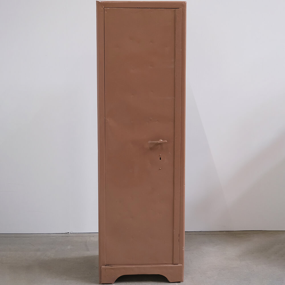 A locker cabinet with attitude. Simple, solid, and straight to the point. The slim design hides surprisingly good storage space with both shelves and drawers, keeping most things organised, or at least giving you a good chance to. The warm, dusty brown colour and the small traces of previous use give the cabinet an authentic and industrial look that cannot be manufactured. Inside, you will find practical details such as hooks in the door, shelves for organisation, and drawers for the small things that tend to disappear. Perfect for the hallway, bedroom, or as a raw element in a modern space. A cabinet with history and room to create your own.