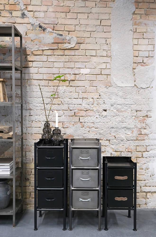 Chest of drawers with a raw design and cool finish in black lacquered iron. The chest of drawers has 3 spacious drawers, which makes it extremely practical and functional. Each drawer is 18 cm high, 25 cm wide and 29 cm deep. These measures allow a good storage space. In the same series you will find other models and colors. Please look for Saga in the shop.