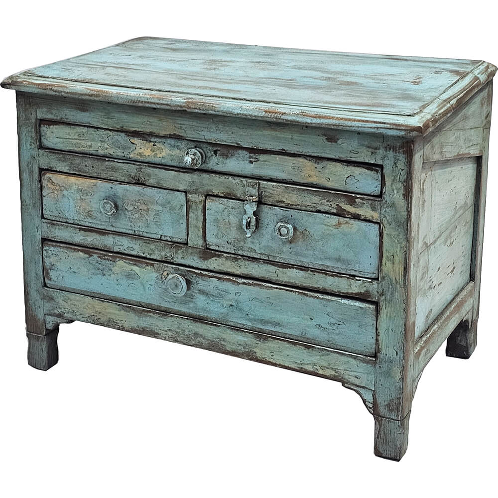 This small old chest of drawers has a charming and lively expression, and the traces of time are clearly visible. It is painted in a muted green-blue tone, beautifully patinated with flaking paint, wear, and subtle colour shifts that give the piece depth and personality. The surface tells its own story and makes the chest of drawers completely unique. The chest is fitted with four drawers in varying sizes, providing practical storage for smaller items. The original handles and the small central lock underline the authentic character and add to the furniture’s historical feel. Its compact size makes it easy to place and it is ideal as a bedside table, in the entrance, or as a decorative storage piece in the living room.