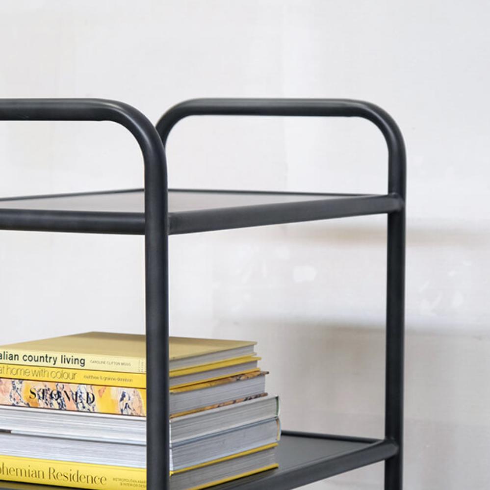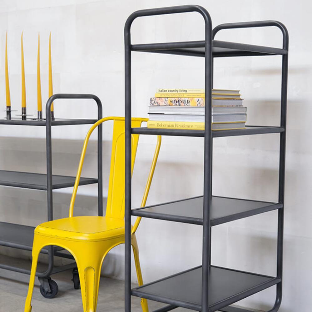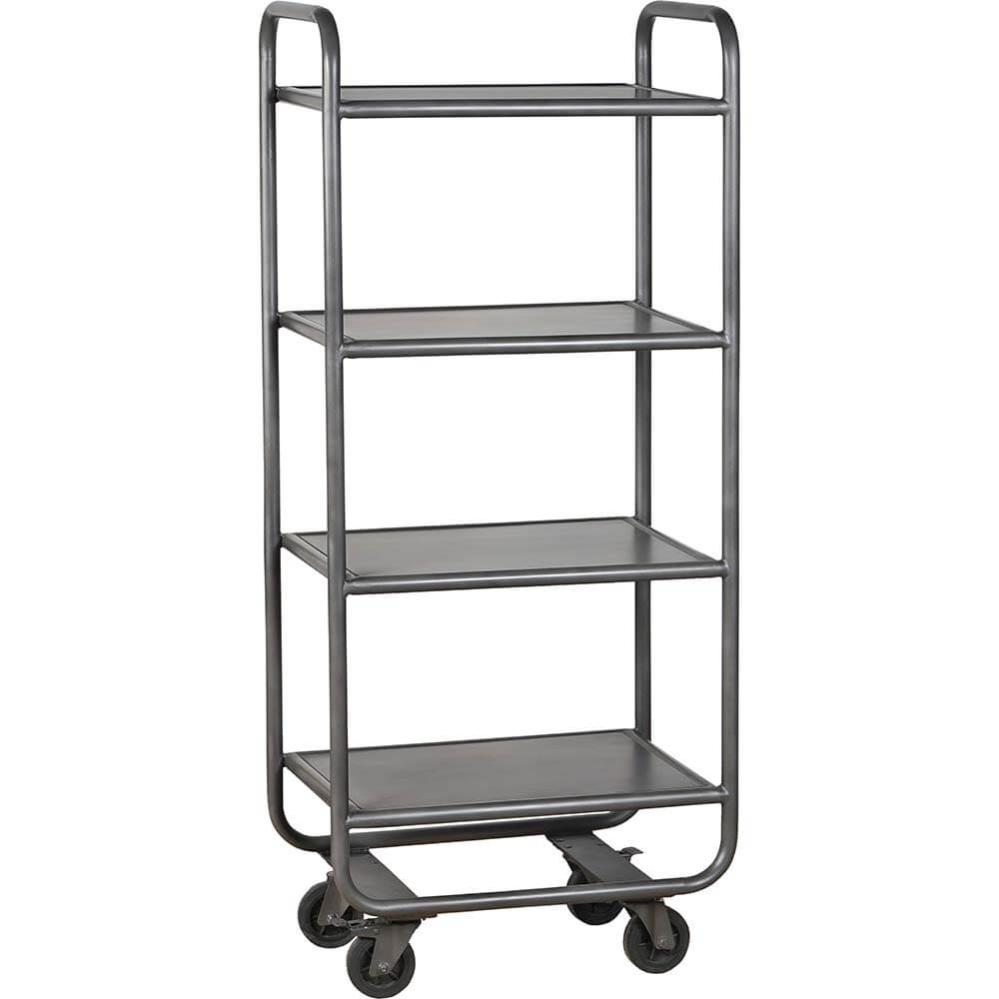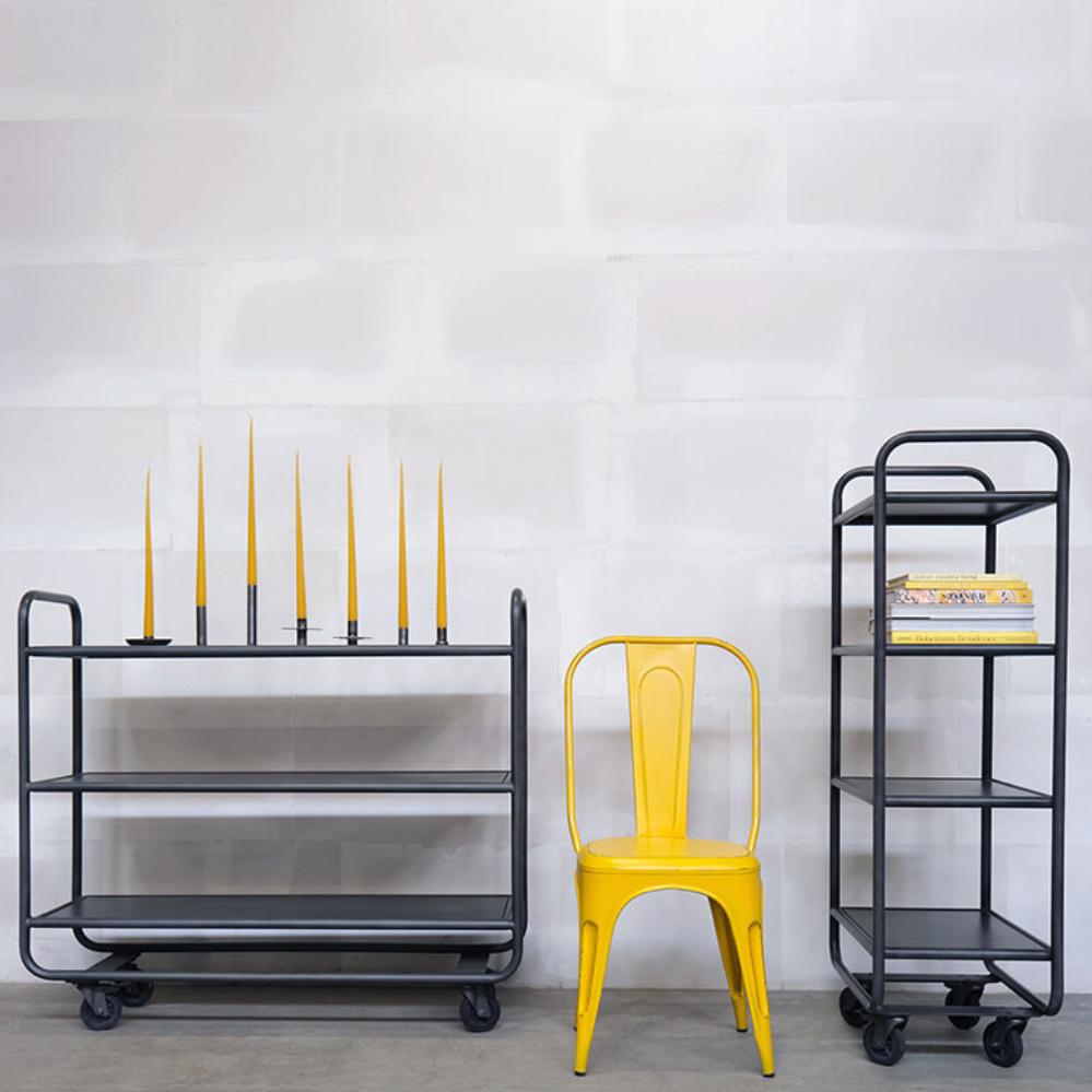 Create a raw and industrially inspired atmosphere with our mobile rack with four shelves. This rack is designed with a robust and durable metal frame and features four spacious shelves that provide plenty of storage space. The built-in wheels make it easy to move the rack as needed. Use it in the living room, office, or shop. Use it in the living room, office, or in the store. For those who like a functional and stylish storage solution with a raw edge. The shelf is available in two other matching sizes. Search for St. Louis in the shop. The space between the shelves is 31 cm.
