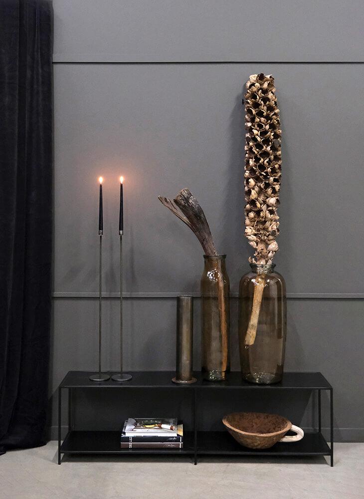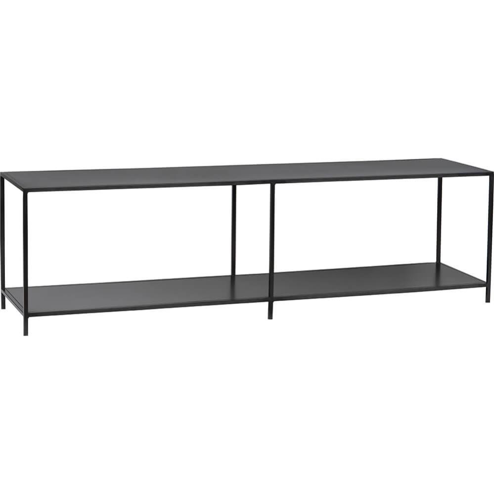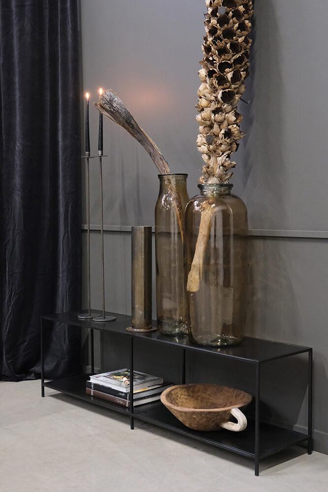 Narrow black-painted iron shelf. Its narrow, elongated shape makes it ideal as a TV stand or a low console table. The durable iron construction, combined with the minimalist design, gives it a timeless expression that fits into any interior style. Use it for storage, books, or decorative elements. With our iron rack, you add both functionality and style to your interior. This rack is available in four other versions. Search for Washington in the search field. The space between the shelves is 37 cm.