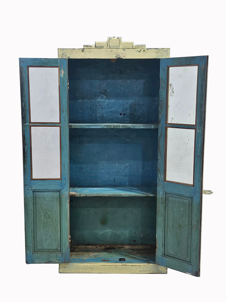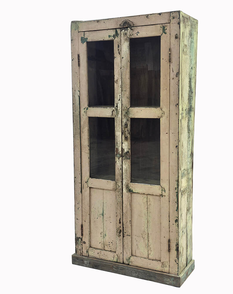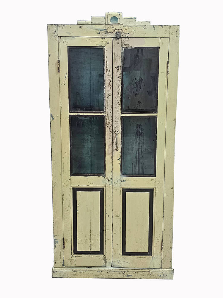 This light yellow display cabinet has a charming expression with plenty of patina and history. Made of wood, the cabinet features a beautifully worn surface where the soft, muted yellow colour is broken by traces of time, small areas of flaking paint, and natural irregularities that give the piece its distinctive character. The cabinet has two doors with glass panels in the upper section, offering a gentle view of the contents and making it ideal for both storage and display. Inside, two shelves provide ample space for tableware, glassware, books, or decorative objects. The lower part of the doors is solid, creating a nice balance between an open and a more calm, grounded expression. An atmospheric and functional cabinet that fits beautifully into the kitchen, living room, or dining area, adding warmth, personality, and a touch of history to the space.