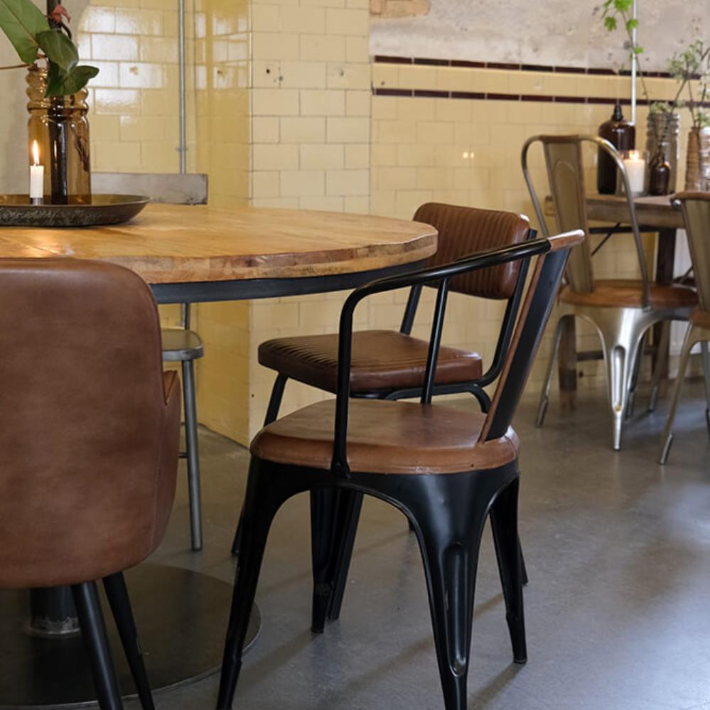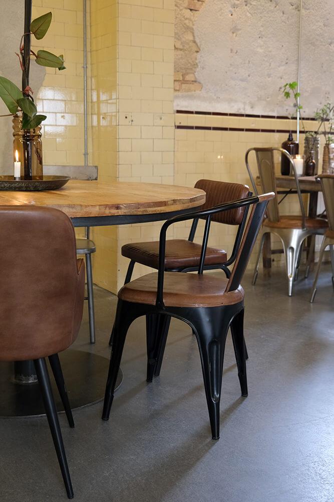 The Living dining chair with armrests perfectly combines raw design and functionality. Featuring a sturdy frame in black-lacquered iron and a cognac-colored leather seat and backrest without padding, the chair exudes a cool, industrial vibe. The dining chair is stackable, making it practical for both private and professional spaces such as cafés or restaurants. A timeless chair that is not only comfortable to sit in but also adds edge and character to any interior.