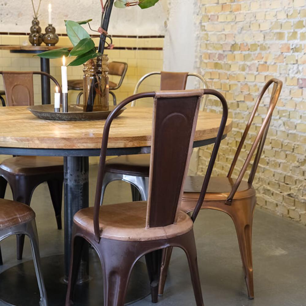 This Living dining chair with a high backrest is a rustic and robust chair with an industrial look. If you want more comfort, you can order a leather cushion in either black or brown leather. Take a look in the webshop under M1402 or M1405. You can also put a lambskin on the chair if you want it to appear more cozy. This chair is in a copper finish. If you want a different color or finish, there are many other chairs to choose from in the Living series. They are also great to mix in colors and finishes around a large meeting or dining table.