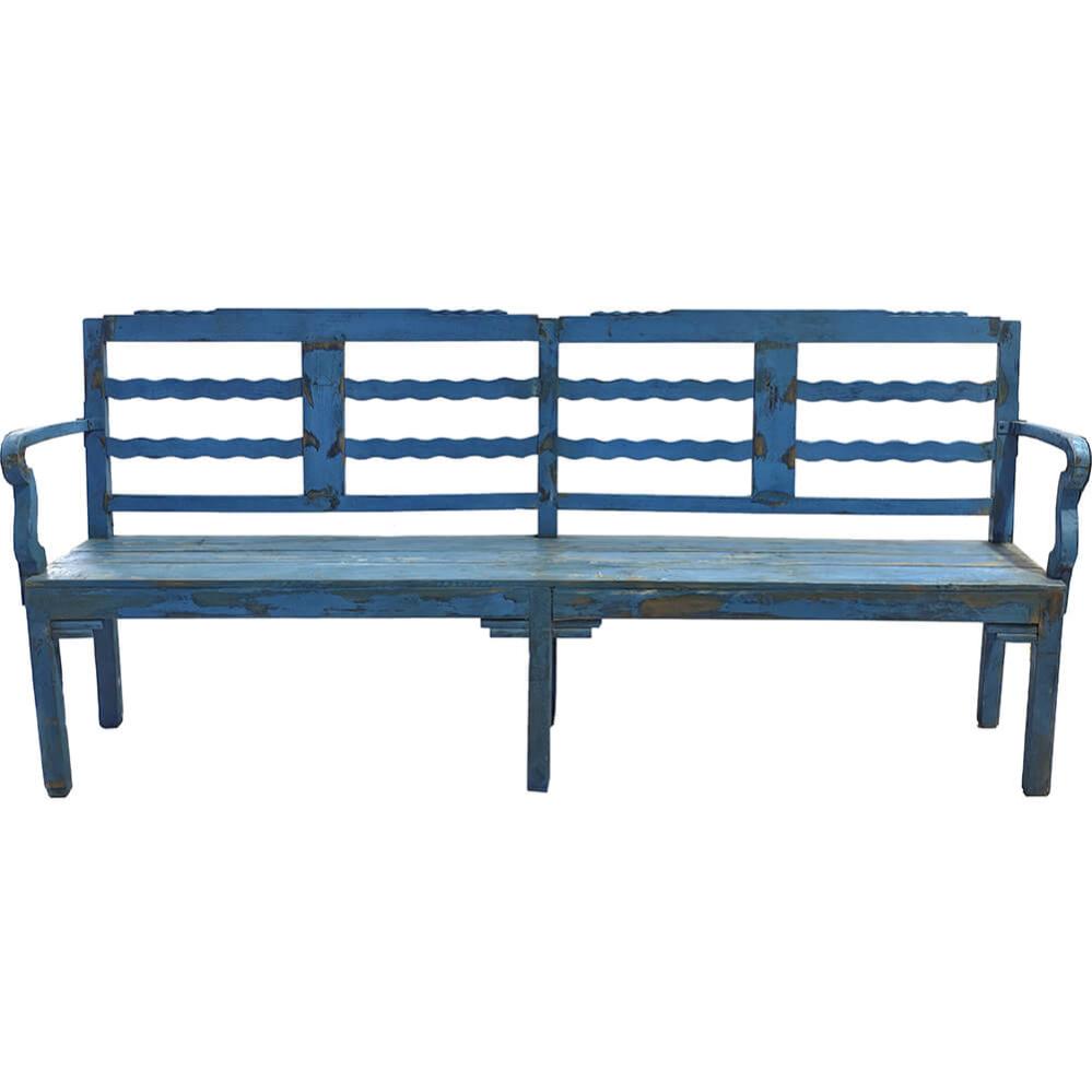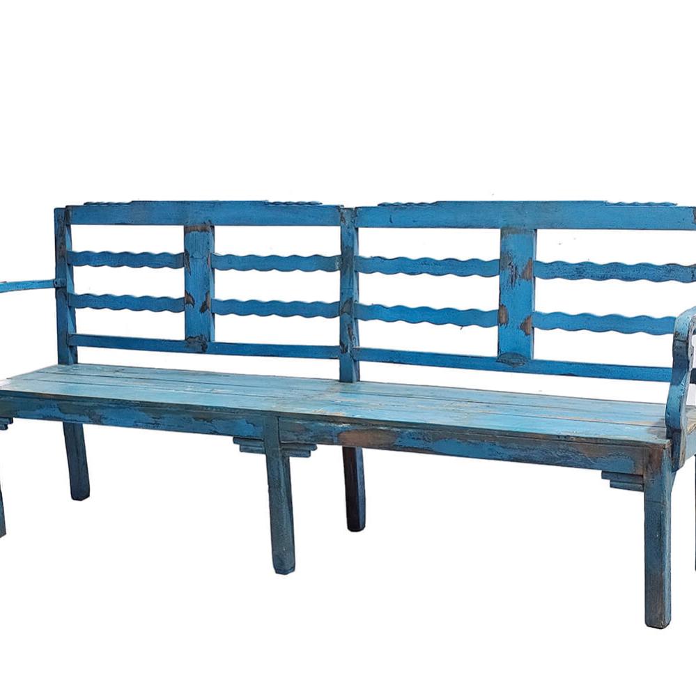 Here’s a bench that refuses to blend into the background. The vibrant blue colour and the wavy slats of the backrest give it a playful expression, while the worn paint and patina reveal a long and well-lived past. With its generous length, there’s plenty of room for both coffee breaks and good conversations. The solid wooden construction and rounded armrests make it both comfortable and practical, whether placed in a hallway, a conservatory, or as a statement piece in a shop. A bench with attitude and history.
