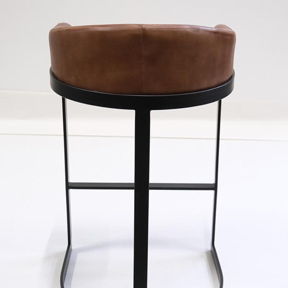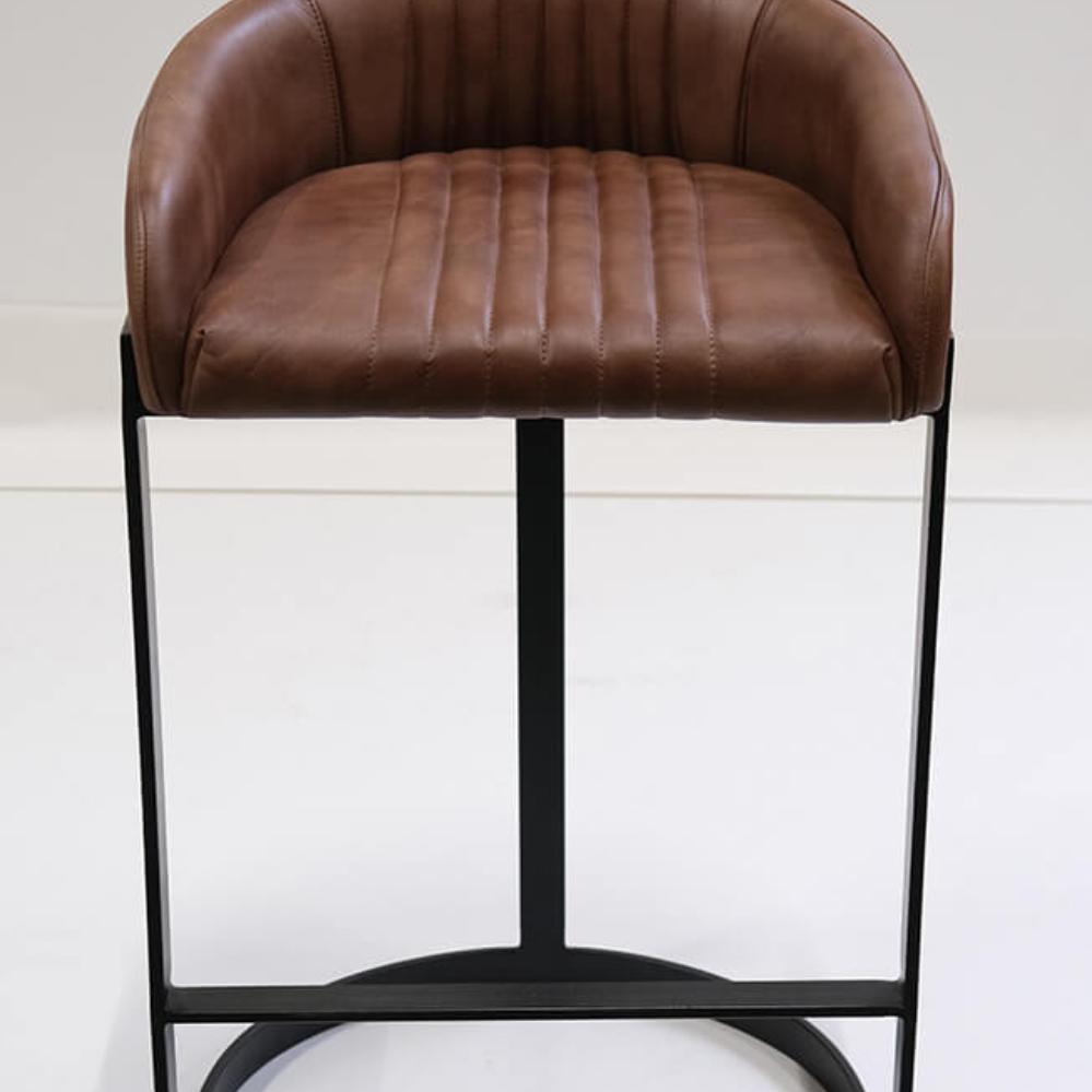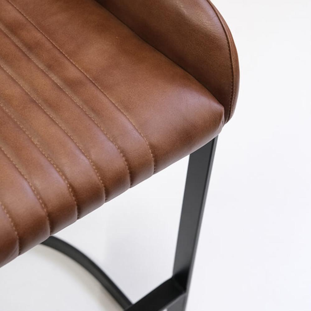 This tall bar stool combines an organic shape with a raw expression. The soft, brown quilted leather provides comfort and style, while the black metal frame adds an industrial-inspired edge. The bar stool features both a deep seating surface, a backrest, and a footrest, enhancing its comfort. Perfect for the bar or café, where functionality meets character and a masculine appearance.
