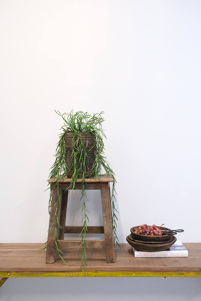 This sturdy teak stool is a small piece of furniture with a big personality. The angled legs and worn wood speak of many years of loyal service, giving the stool plenty of character. It has a simple shape, a solid build, and is easy to move around. Use it as extra seating, a plant stand, a bedside table, or a small side table, the possibilities are many, and its look fits seamlessly into rustic, industrial, or more natural interiors. Each stool has its own unique expression, and no two are exactly alike.