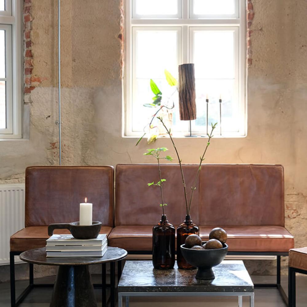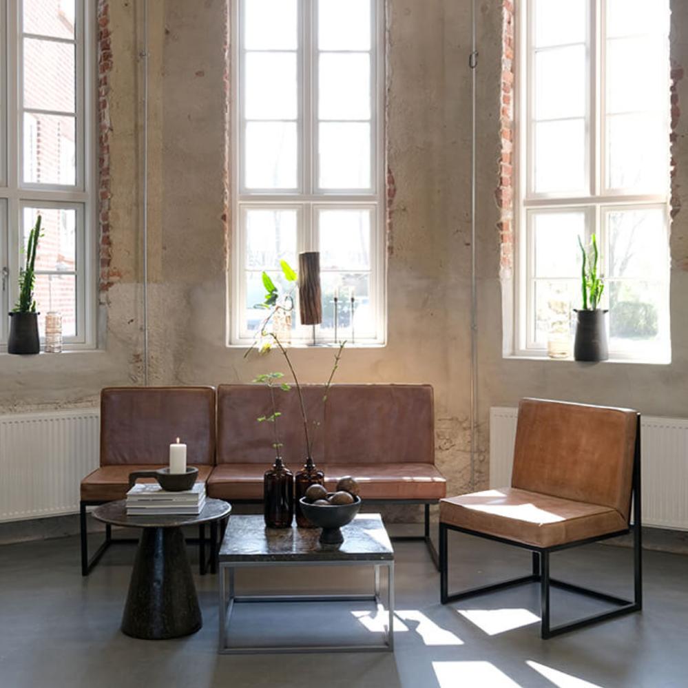 A sleek and stylish lounge sofa with a beautiful finish in warm cognac-colored leather. The black metal frame adds a raw and modern touch, making it a classic in both rustic and industrial settings. The seating comfort is top-notch, as the seat and backrest are designed to provide optimal support. The leather adds a luxurious feel and only becomes more beautiful over time as it develops a natural patina. The timeless design of the lounge sofa makes it easy to combine with other furniture, yet it can also stand alone as a statement piece. Perfect for a café, lounge area, or as a stylish addition to a living room or hallway at home. A lounge sofa that combines comfort, function, and character.