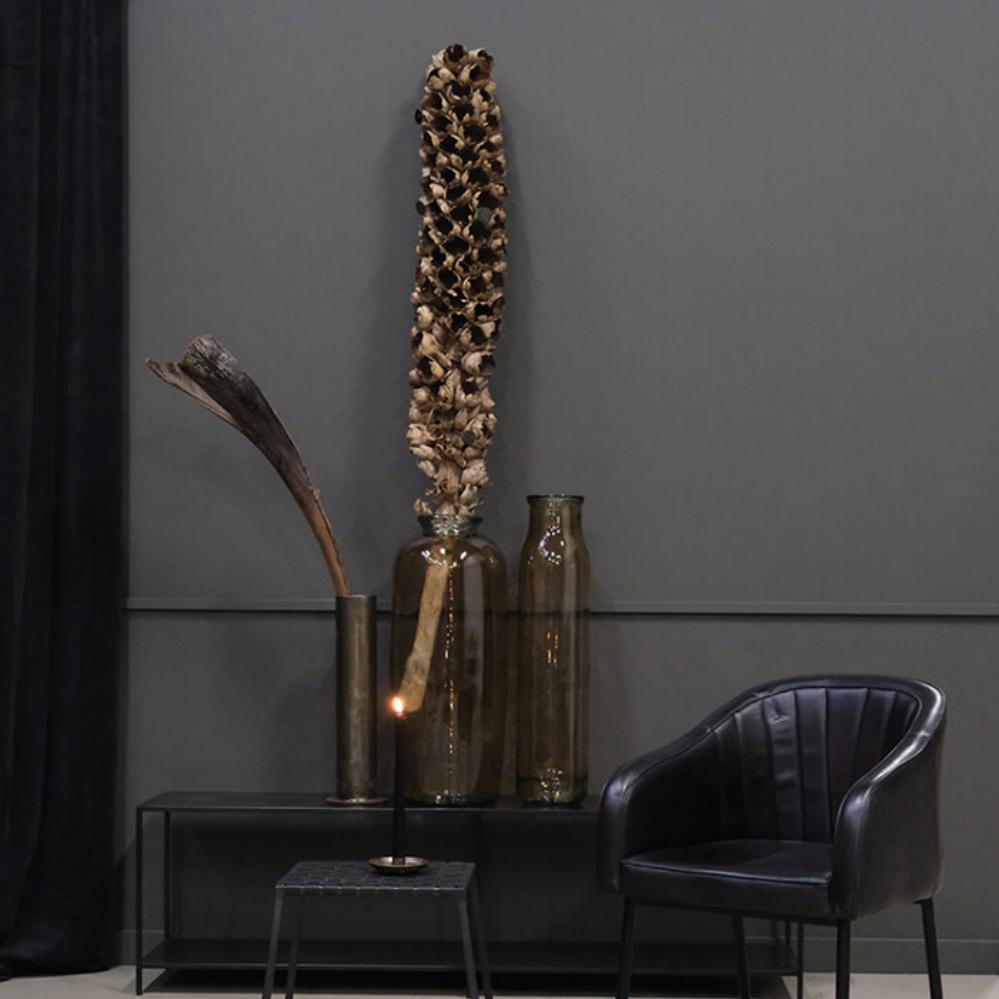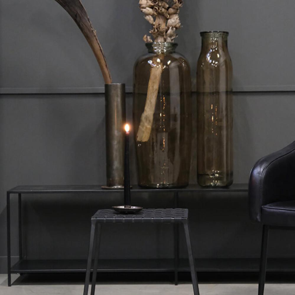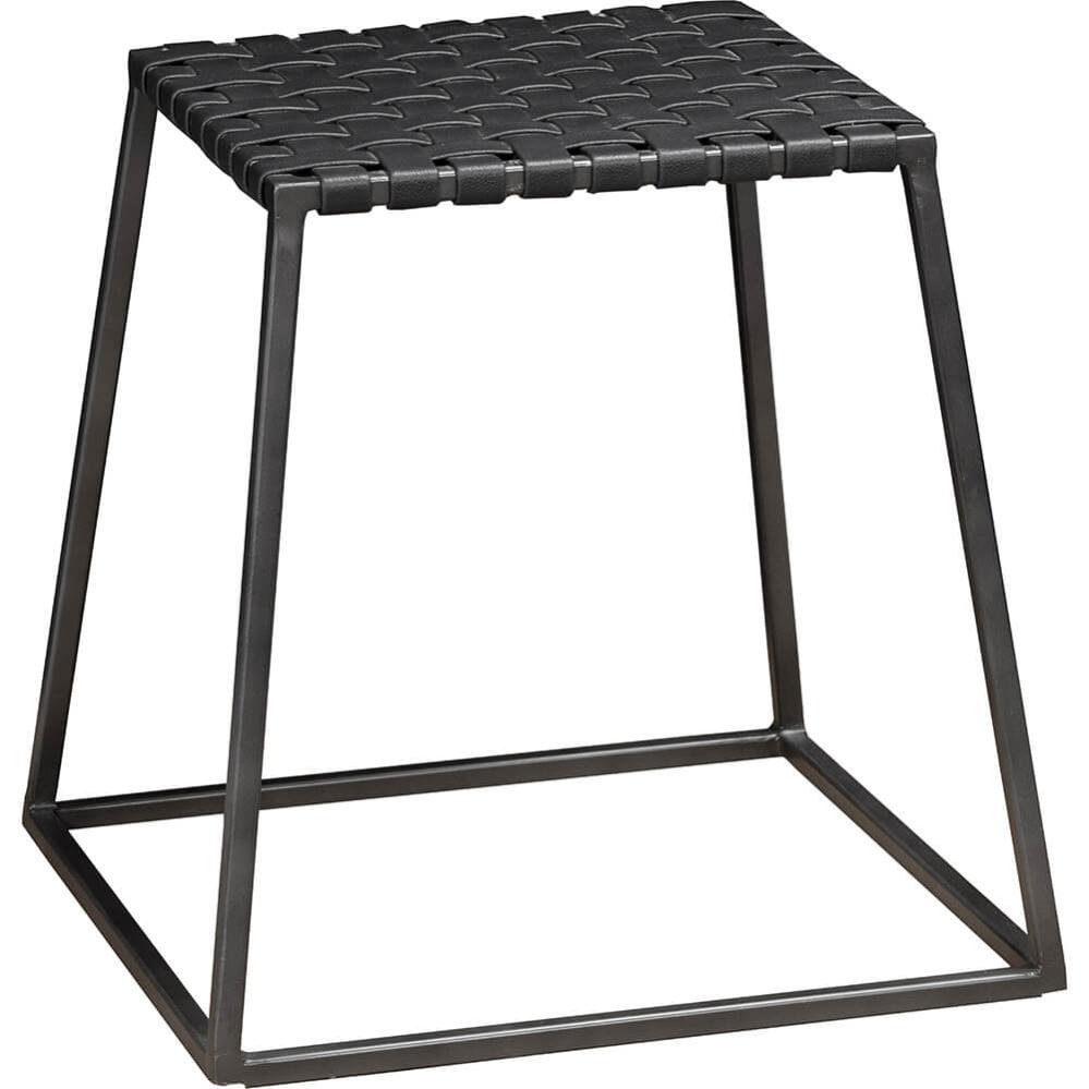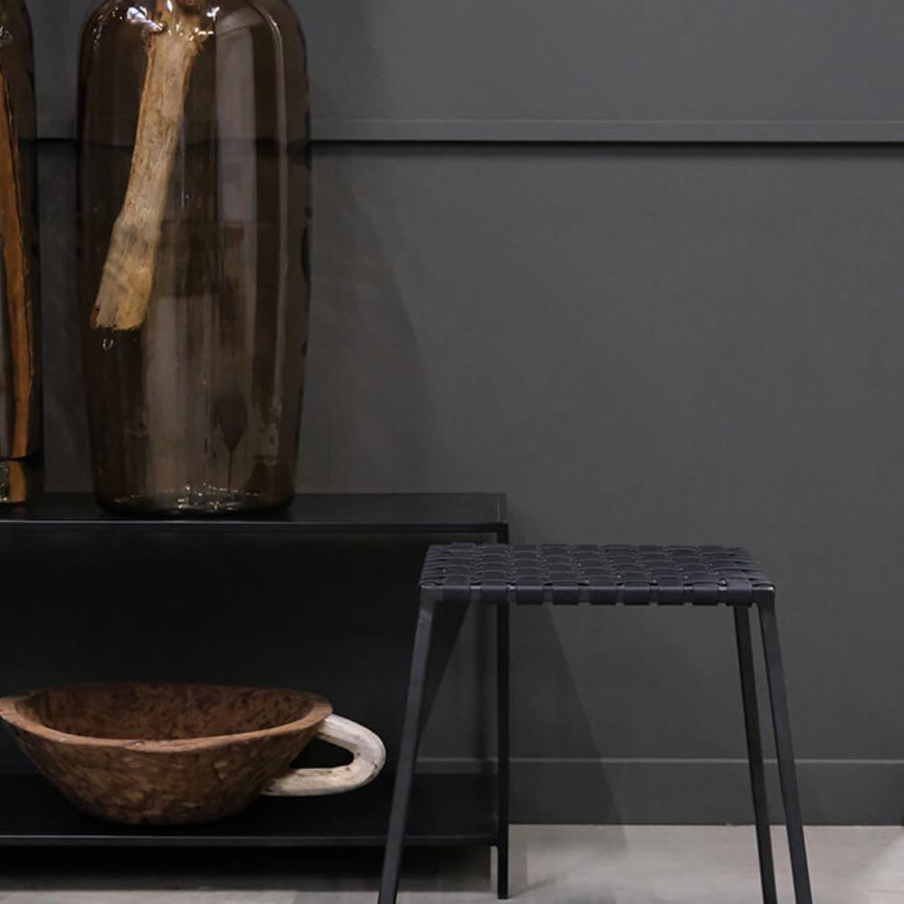 Cool iron stool with a braided seat in black faux leather. This stool combines raw and industrial elements in its design, and can be used in any room. The black faux leather braided seat adds comfort and style to the stool, while the durable iron frame provides stability. Use this stool as a decorative piece or a practical seating option that exudes raw charm and style.