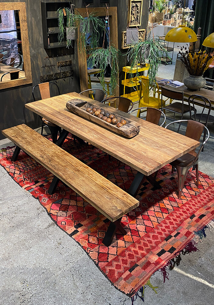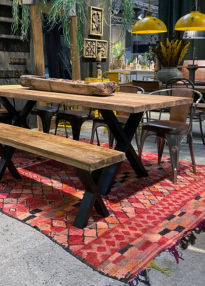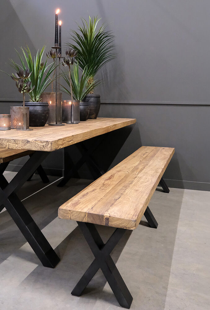 This long bench in rustic wood with a sturdy iron cross-frame combines beauty and functionality. This impressive bench offers ample seating and is a beautiful example of true craftsmanship. The rustic wood and robust iron frame create a harmonious contrast that adds character to any space. Use it as a stylish seating solution at the dining table, in the entryway, or wherever you want to infuse a unique rustic charm. Our rustic wood bench is the perfect blend of aesthetics and practicality. (approx. 4.5 cm thick) Find a matching table under item number: M03132 and a matching smaller bench under item number: M1854