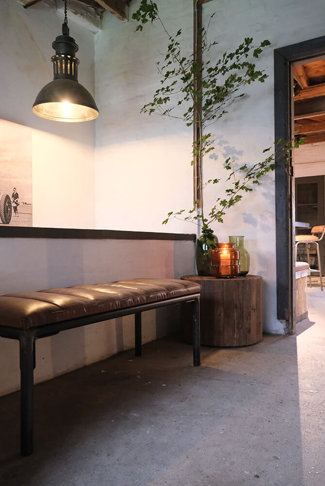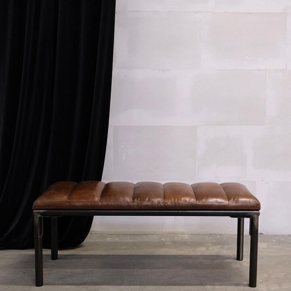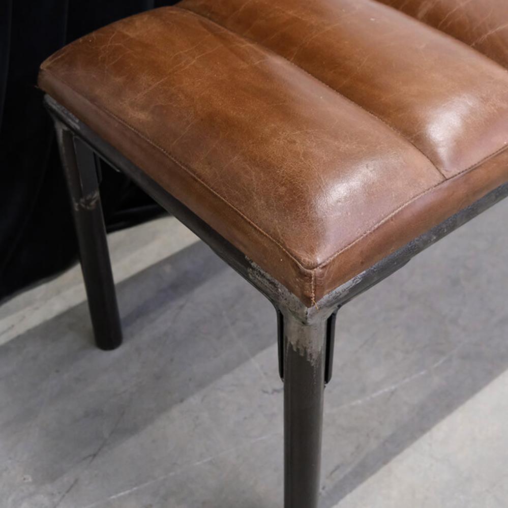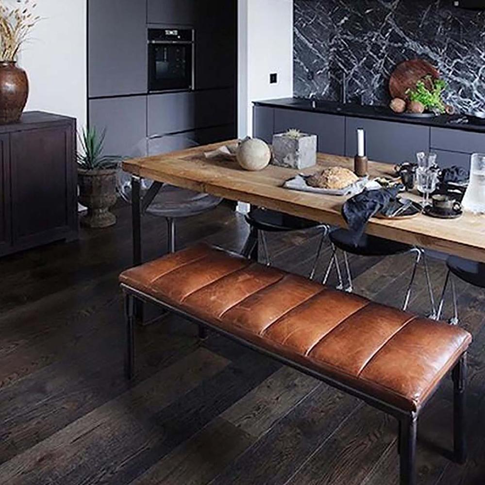 The Sean bench combines stylish design with practical usability. The brown leather upholstery contributes to a comfortable seating experience, while the dark iron legs add an industrial flair. The bench fits into many different interior styles and can quickly create extra seating or be used as a bench in the entrance area.
