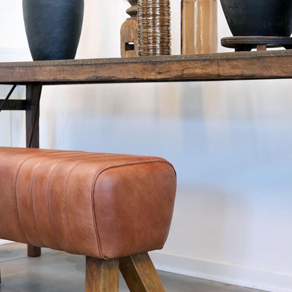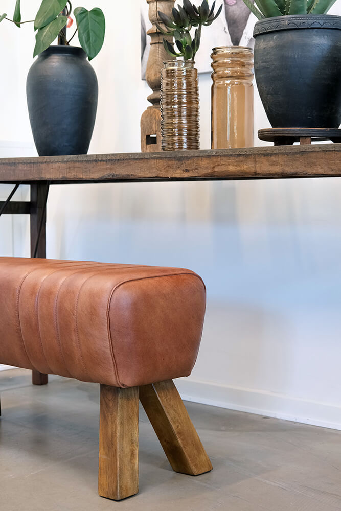 A stylish and simple pouf in quilted leather. The pouf features a lovely vintage look with beautiful cognac-colored leather that adds a warm feel to the room. The solid wooden legs ensure durability and sturdiness—perfect for everyday use. The quilted design adds a classic and timeless touch, making it suitable for both modern and rustic interiors. Ideal for the entryway as a practical seat, at the foot of the bed as a stylish addition, or as a decorative and functional detail in your restaurant or shop. The possibilities are endless with this beautiful and versatile pouf.
