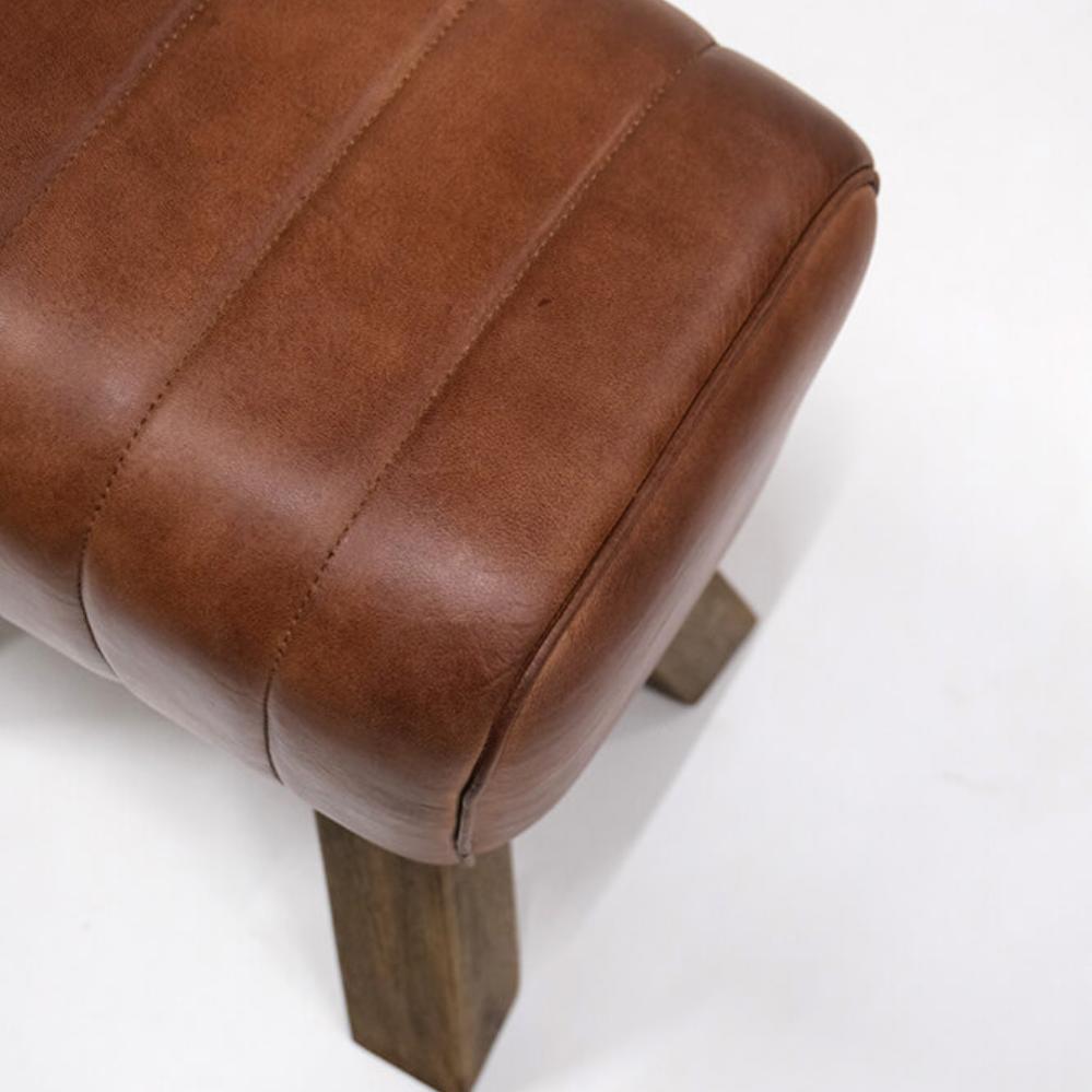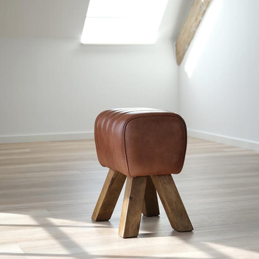 This small Wilma stool, inspired by the classic "gym pommel horse," features a stunning quilted brown leather finish and solid wooden legs. The stool exudes a cool and authentic "old school" vibe, adding a rustic and raw touch to your interior. The sturdy wooden legs ensure stability and durability, while the soft leather with its warm brown hue offers both comfort and charm. Perfect as a practical stool in the hallway, a stylish accent in the living room, or a unique seating option in a shop or café. A small yet striking addition to your decor that combines function and character.