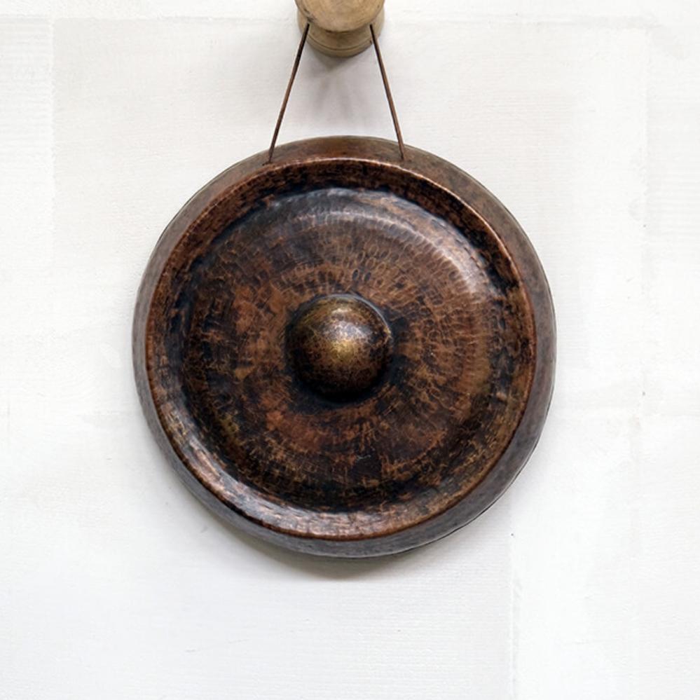This hand-hammered gong is a raw and authentic addition to any interior. With its dark, patinated surface and distinctive hammered pattern, it brings a touch of ancient Asian mystique into the space. The included percussion mallet makes it easy to let its deep tone resonate throughout the room. Imagine this gong hanging in a bar, restaurant, shop, or your home—ready to be used for anything from marking a special occasion to adding a raw, decorative detail to the wall. This gong is for those who love unique and slightly unconventional elements in their decor.