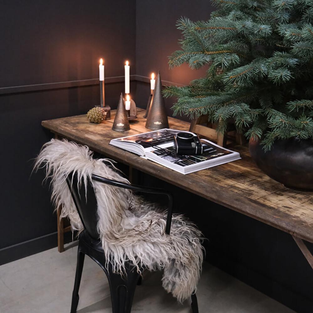 Rustic Christmas tree in perforated iron with a base that fits both small and large tealights. Give your Christmas decorations a raw touch with this Christmas tree, which can be used both for tealights or with a light chain and is turned over and used as a cone. Use four of the beautiful Christmas trees as a nice and easy rethinking of the traditional Advent wreath. Add a few pine twigs or eucalyptus vines and a few cones, a voila! Pssst, also available in a smaller size (M16649) so you can mix it as you like.