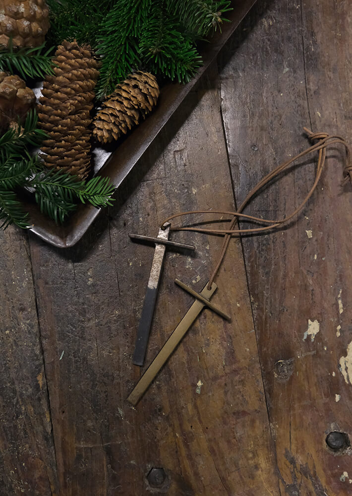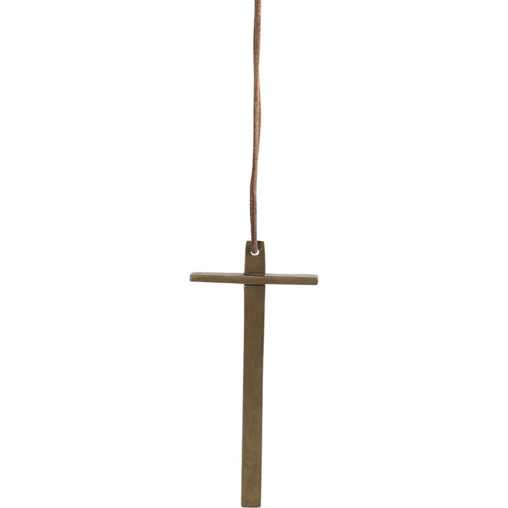 A sleek iron cross painted in a warm antique brass color that combines a refined and raw expression. The cross is fitted with a leather cord, emphasizing the simple design and making it easy to hang. Use it as a decorative detail on the wall or as a small display on a table. A timeless symbol that adds atmosphere and character to your interior.