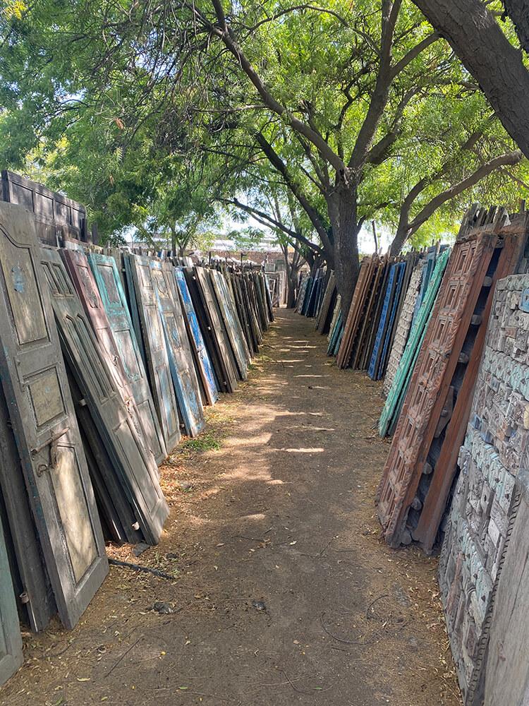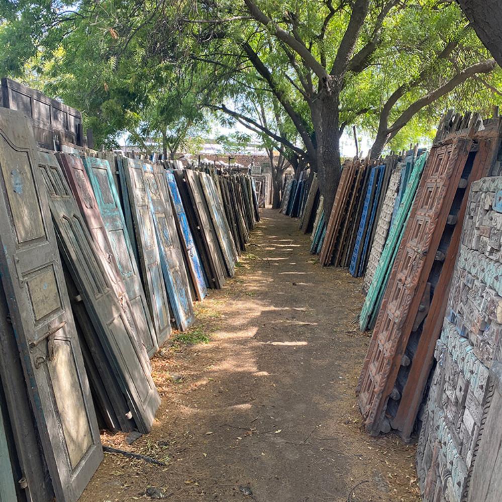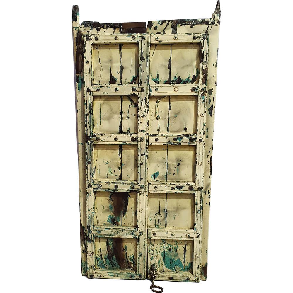 This beautiful old wooden door in a muted yellow hue is anything but boring. It’s full of details and patina that clearly reveal its history. Dark cracks, peeling paint, and hints of turquoise brushstrokes make the door a true eye-catcher, and there’s something almost artistic about its imperfect surfaces. The small square panels and rustic iron nails add a graphic rhythm, and at the bottom, a rusty metal chain still hangs, perhaps it once kept something important locked away. Now, it serves as a charming little reminder of the door’s past life. Use it as a unique decorative piece, leaning against a wall or as part of a creative interior. One thing’s for sure: this door holds stories, and it’s more than ready to become part of yours.