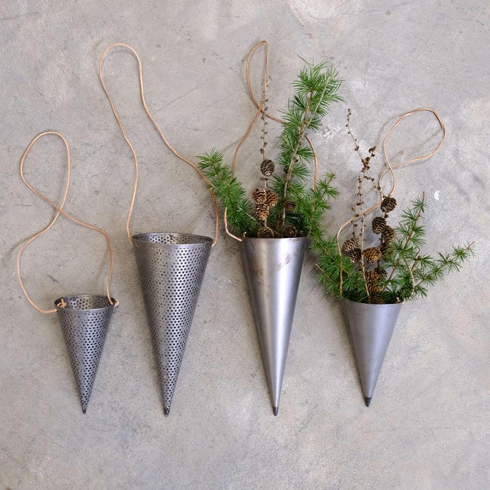 Raw and rustic iron cone with 40 cm leather suspension. Hang the cone from the ceiling or in your window and mix it with the cones in the series from Trademark Living for a cool and simple look. Add a branch with some delicious Christmas decorations or use the iron cone as a nice detail in your table decoration or table setting at Christmas.