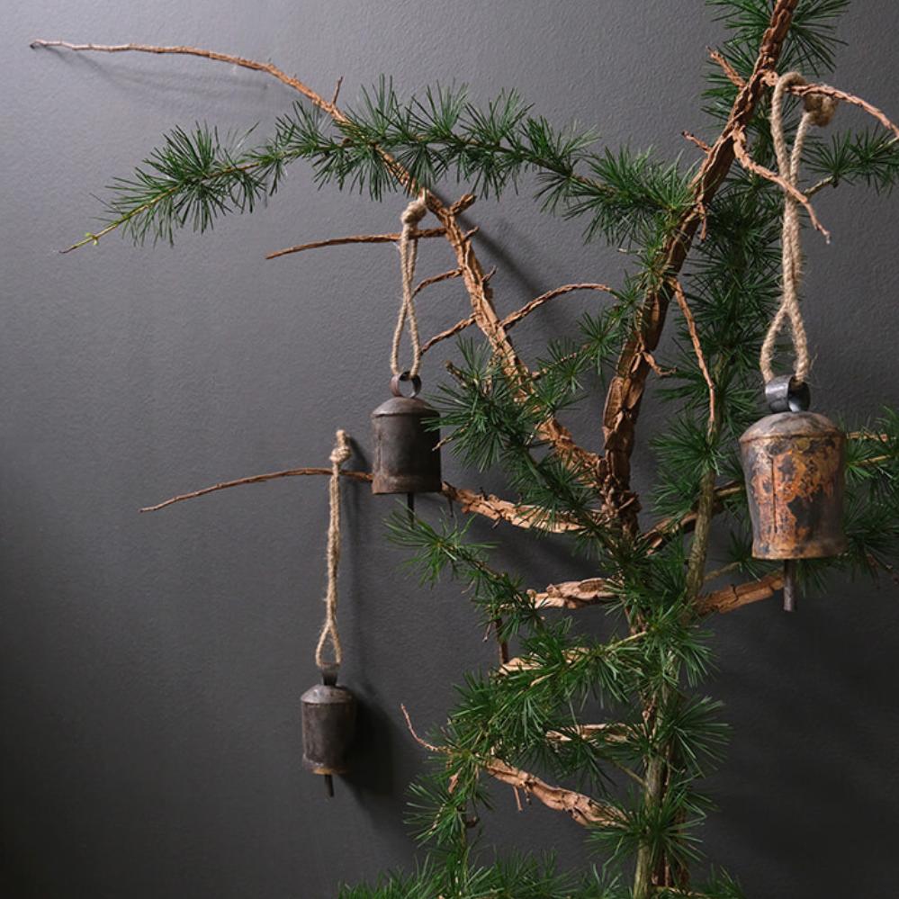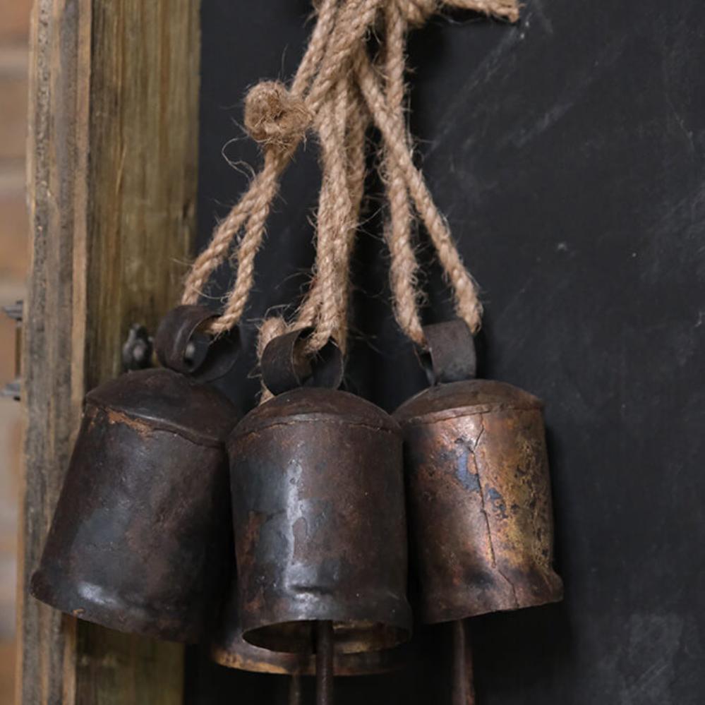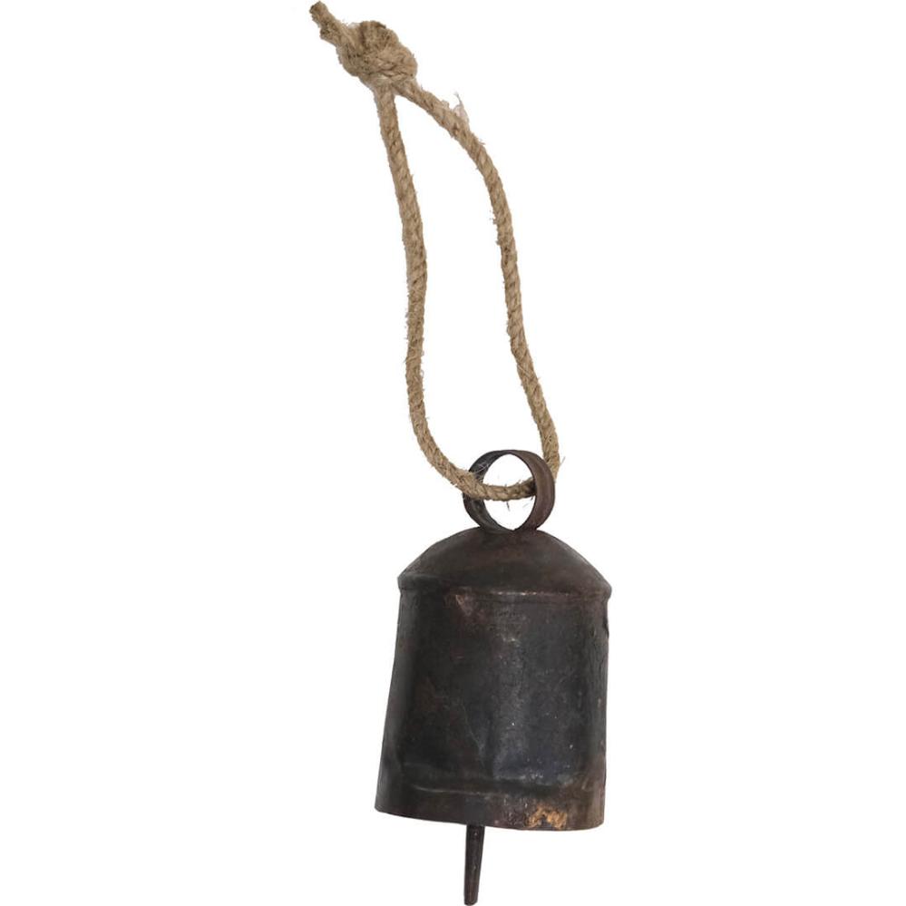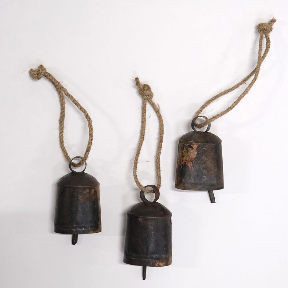 Rustic old iron bell with approx. 20 cm jute cord The bells are used in India to hang on the cow’s collar. We have simply added a small jute string, so the bell can find another use in your interior. The beautiful patinated bells are decorative for hanging on strong branches at Christmas.
